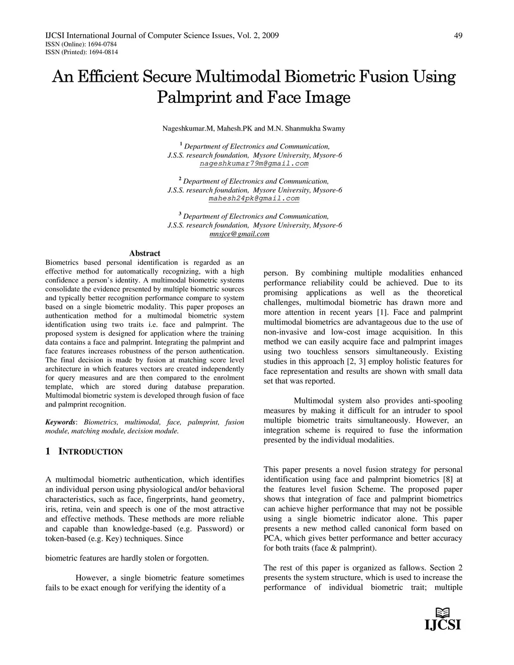 An Efficient Secure Multimodal Biometric Fusion Using Palmprint and Face