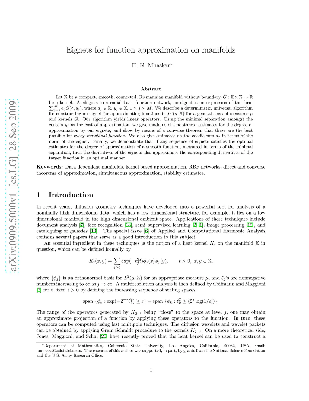 Let be a compact, smooth, connected, Riemannian manifold without boundary, be a kernel. Analogous to a radial basis function network, an eignet is an expression of the form , where , , . We describe a deterministic, universal algorithm for constructing an eignet for approximating functions in for a general class of measures and kernels . Our algorithm yields linear operators. Using the minimal separation amongst the centers as the cost of approximation, we give modulus of smoothness estimates for the degree of approximation by our eignets, and show by means of a converse theorem that these are the best possible for every \emph{individual function}. We also give estimates on the coefficients in terms of the norm of the eignet. Finally, we demonstrate that if any sequence of eignets satisfies the optimal estimates for the degree of approximation of a smooth function, measured in terms of the minimal separation, then the derivatives of the eignets also approximate the corresponding derivatives of the target function in an optimal manner.