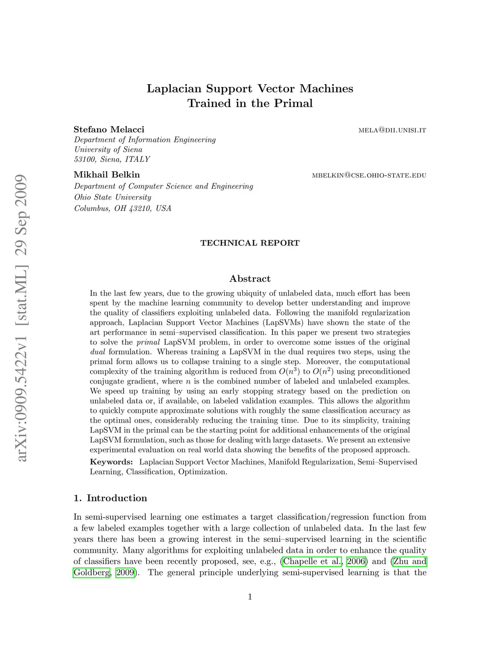In the last few years, due to the growing ubiquity of unlabeled data, much effort has been spent by the machine learning community to develop better understanding and improve the quality of classifiers exploiting unlabeled data. Following the manifold regularization approach, Laplacian Support Vector Machines (LapSVMs) have shown the state of the art performance in semi--supervised classification. In this paper we present two strategies to solve the primal LapSVM problem, in order to overcome some issues of the original dual formulation. Whereas training a LapSVM in the dual requires two steps, using the primal form allows us to collapse training to a single step. Moreover, the computational complexity of the training algorithm is reduced from O(n^3) to O(n^2) using preconditioned conjugate gradient, where n is the combined number of labeled and unlabeled examples. We speed up training by using an early stopping strategy based on the prediction on unlabeled data or, if available, on labeled validation examples. This allows the algorithm to quickly compute approximate solutions with roughly the same classification accuracy as the optimal ones, considerably reducing the training time. Due to its simplicity, training LapSVM in the primal can be the starting point for additional enhancements of the original LapSVM formulation, such as those for dealing with large datasets. We present an extensive experimental evaluation on real world data showing the benefits of the proposed approach.
