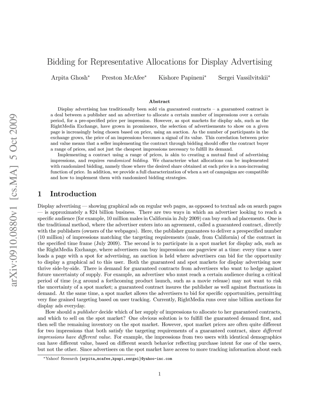 Display advertising has traditionally been sold via guaranteed contracts -- a guaranteed contract is a deal between a publisher and an advertiser to allocate a certain number of impressions over a certain period, for a pre-specified price per impression. However, as spot markets for display ads, such as the RightMedia Exchange, have grown in prominence, the selection of advertisements to show on a given page is increasingly being chosen based on price, using an auction. As the number of participants in the exchange grows, the price of an impressions becomes a signal of its value. This correlation between price and value means that a seller implementing the contract through bidding should offer the contract buyer a range of prices, and not just the cheapest impressions necessary to fulfill its demand. Implementing a contract using a range of prices, is akin to creating a mutual fund of advertising impressions, and requires {\em randomized bidding}. We characterize what allocations can be implemented with randomized bidding, namely those where the desired share obtained at each price is a non-increasing function of price. In addition, we provide a full characterization of when a set of campaigns are compatible and how to implement them with randomized bidding strategies.