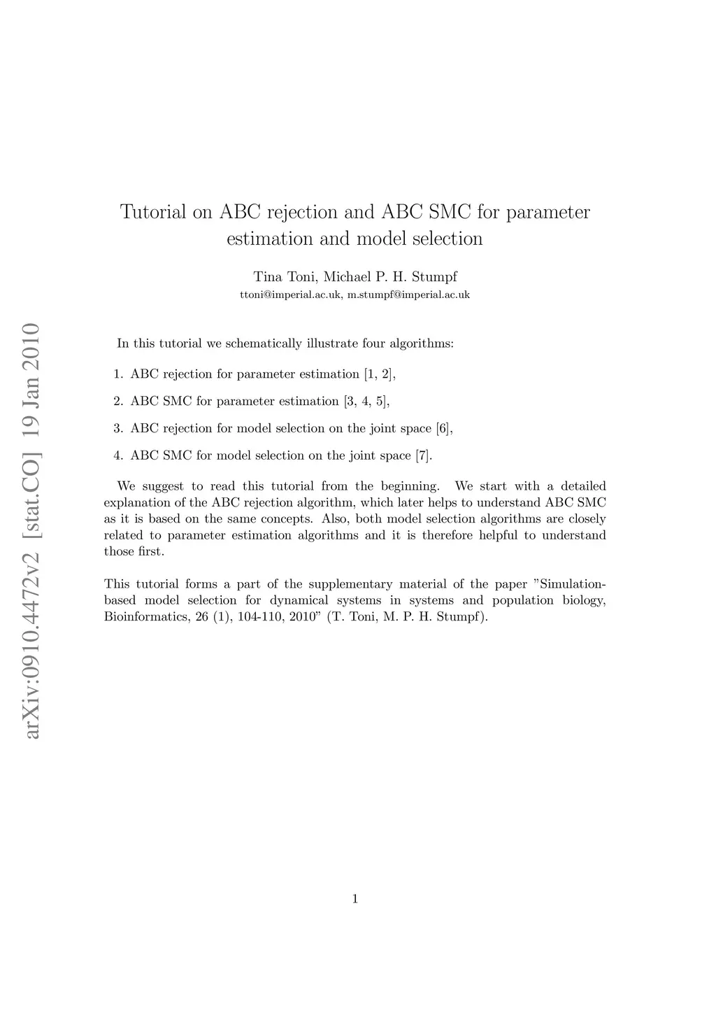 In this tutorial we schematically illustrate four algorithms: (1) ABC rejection for parameter estimation (2) ABC SMC for parameter estimation (3) ABC rejection for model selection on the joint space (4) ABC SMC for model selection on the joint space.