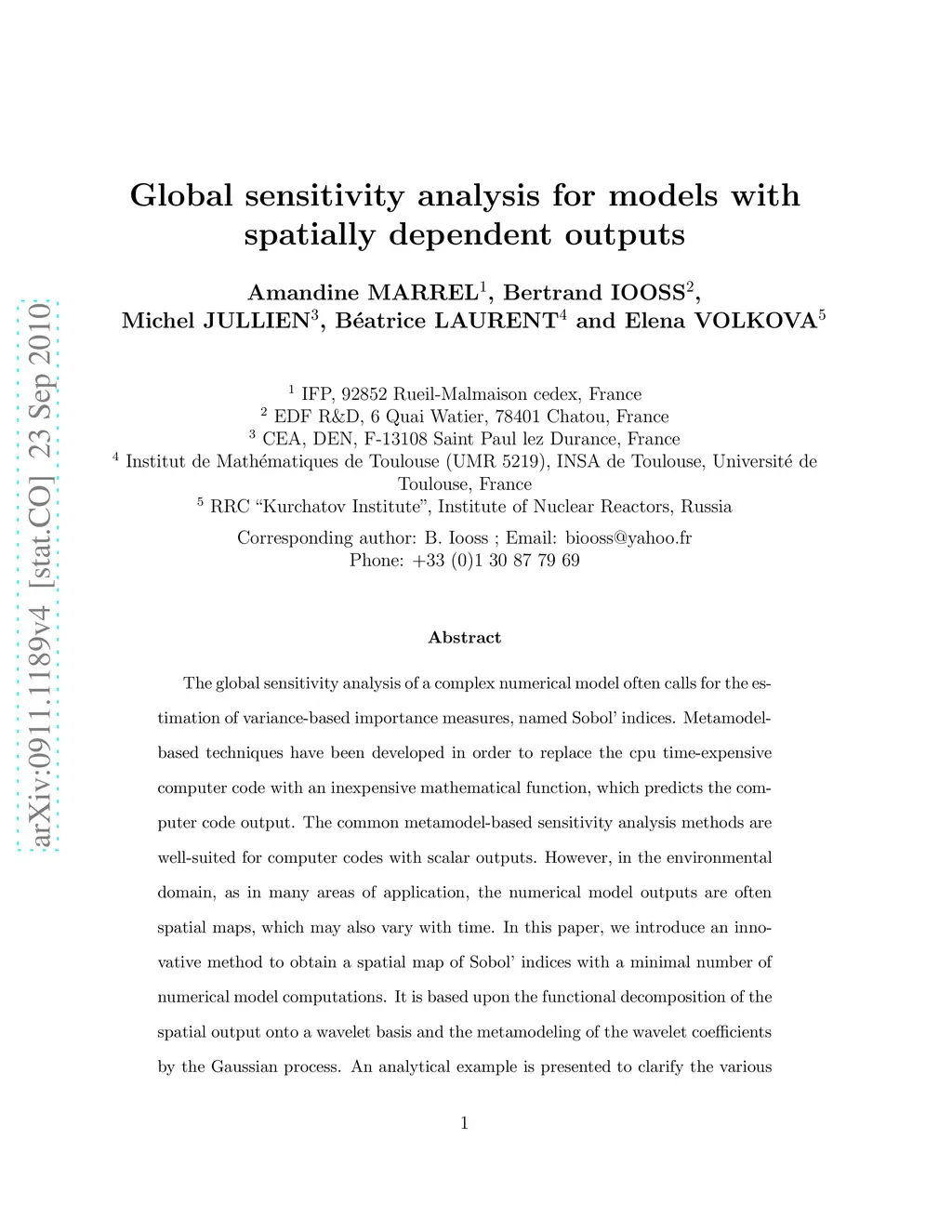 The global sensitivity analysis of a complex numerical model often calls for the estimation of variance-based importance measures, named Sobol' indices. Metamodel-based techniques have been developed in order to replace the cpu time-expensive computer code with an inexpensive mathematical function, which predicts the computer code output. The common metamodel-based sensitivity analysis methods are well-suited for computer codes with scalar outputs. However, in the environmental domain, as in many areas of application, the numerical model outputs are often spatial maps, which may also vary with time. In this paper, we introduce an innovative method to obtain a spatial map of Sobol' indices with a minimal number of numerical model computations. It is based upon the functional decomposition of the spatial output onto a wavelet basis and the metamodeling of the wavelet coefficients by the Gaussian process. An analytical example is presented to clarify the various steps of our methodology. This technique is then applied to a real hydrogeological case: for each model input variable, a spatial map of Sobol' indices is thus obtained.