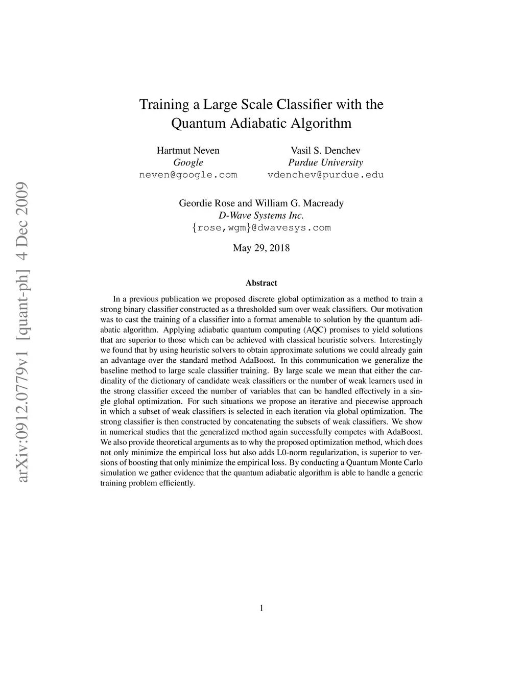 Training a Large Scale Classifier with the Quantum Adiabatic Algorithm