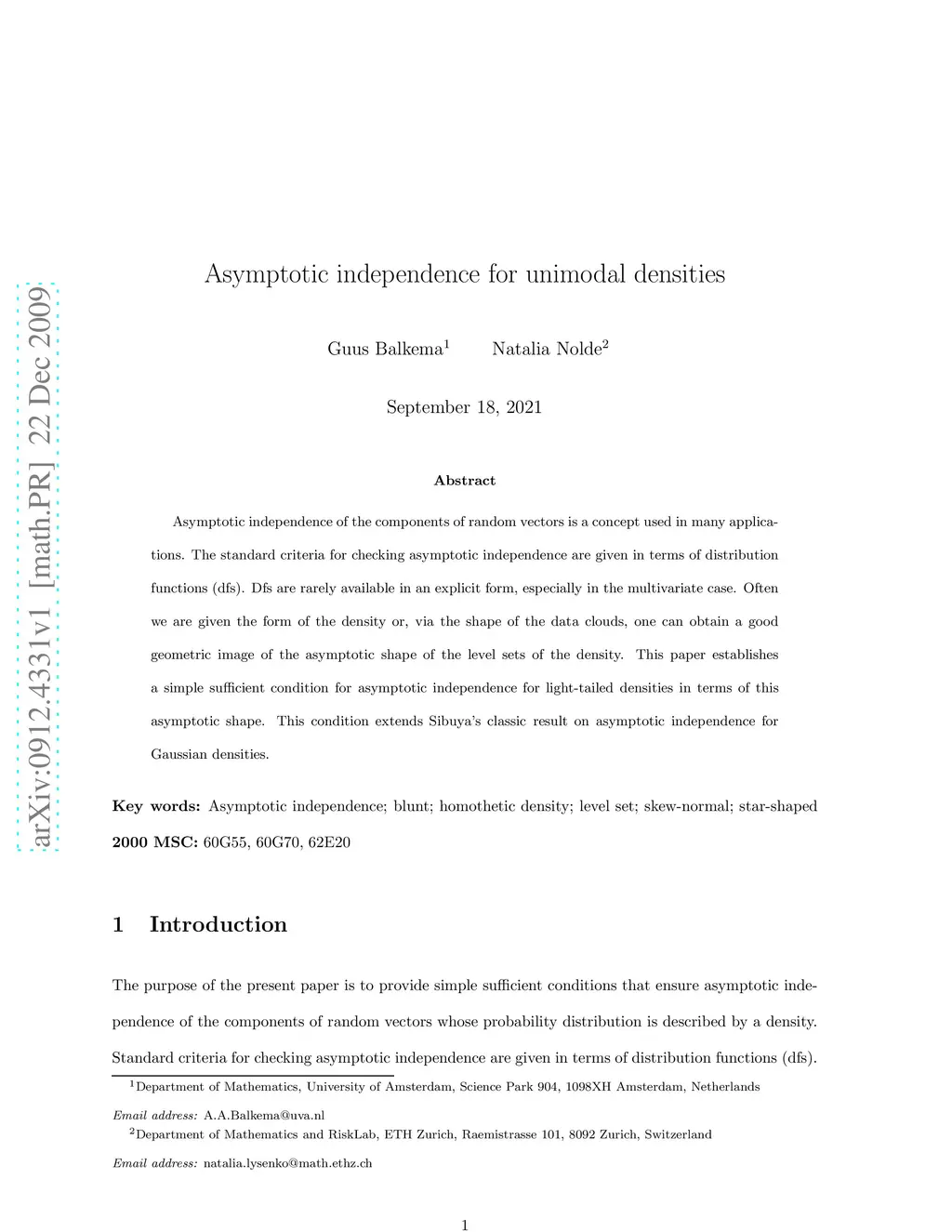Asymptotic independence for unimodal densities