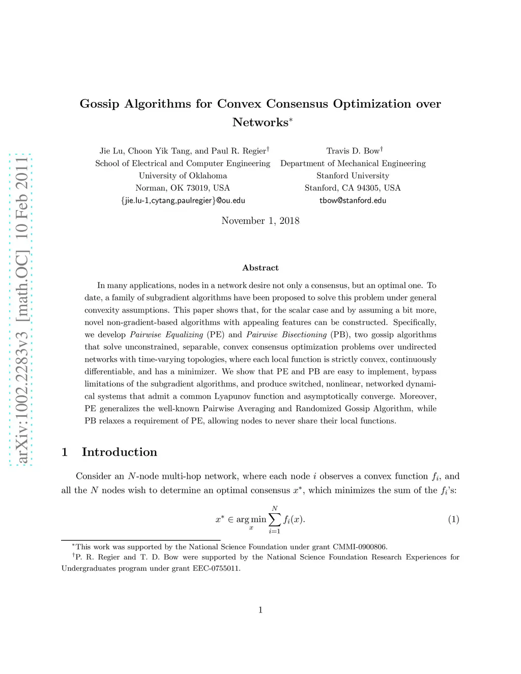 In many applications, nodes in a network desire not only a consensus, but an optimal one. To date, a family of subgradient algorithms have been proposed to solve this problem under general convexity assumptions. This paper shows that, for the scalar case and by assuming a bit more, novel non-gradient-based algorithms with appealing features can be constructed. Specifically, we develop Pairwise Equalizing (PE) and Pairwise Bisectioning (PB), two gossip algorithms that solve unconstrained, separable, convex consensus optimization problems over undirected networks with time-varying topologies, where each local function is strictly convex, continuously differentiable, and has a minimizer. We show that PE and PB are easy to implement, bypass limitations of the subgradient algorithms, and produce switched, nonlinear, networked dynamical systems that admit a common Lyapunov function and asymptotically converge. Moreover, PE generalizes the well-known Pairwise Averaging and Randomized Gossip Algorithm, while PB relaxes a requirement of PE, allowing nodes to never share their local functions.