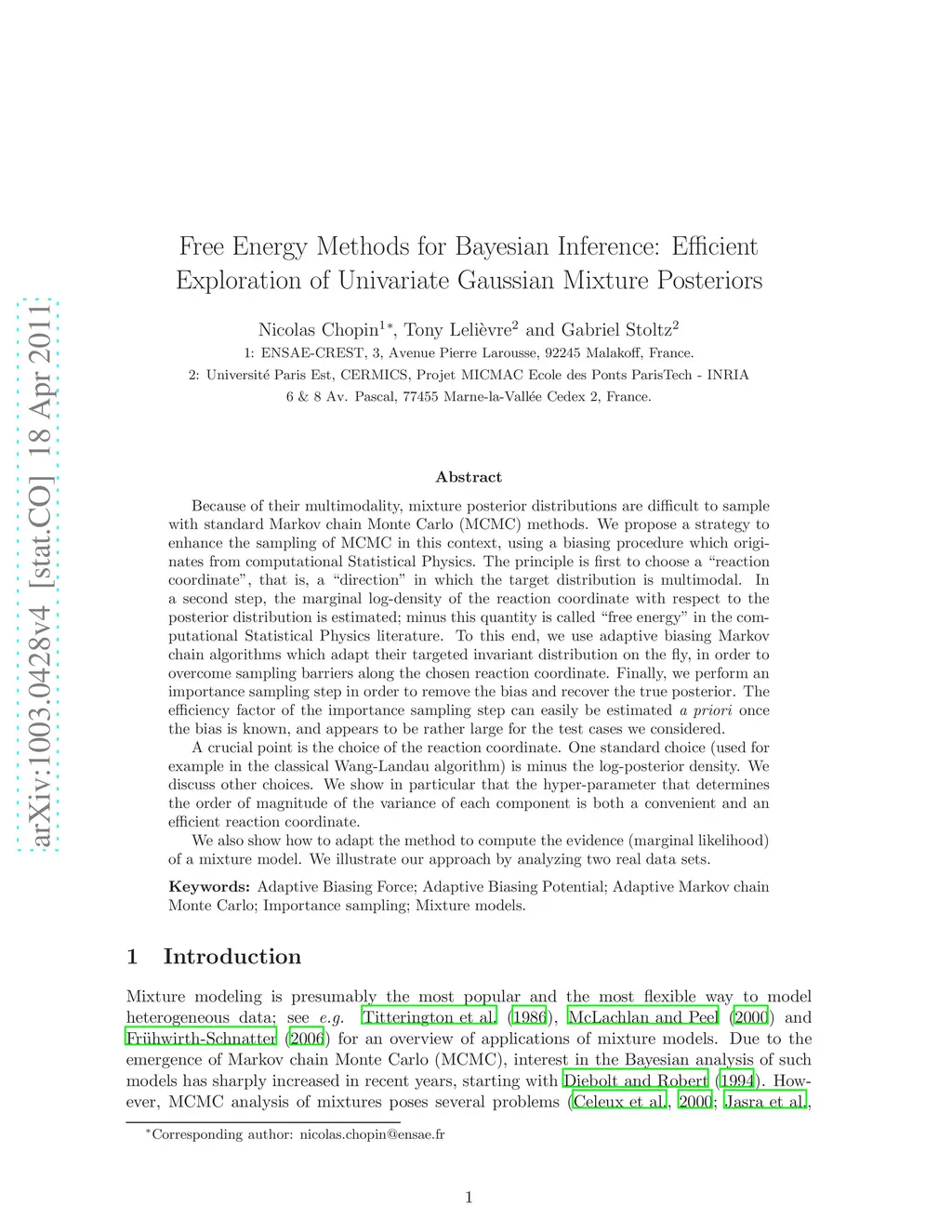Because of their multimodality, mixture posterior distributions are difficult to sample with standard Markov chain Monte Carlo (MCMC) methods. We propose a strategy to enhance the sampling of MCMC in this context, using a biasing procedure which originates from computational Statistical Physics. The principle is first to choose a "reaction coordinate", that is, a "direction" in which the target distribution is multimodal. In a second step, the marginal log-density of the reaction coordinate with respect to the posterior distribution is estimated; minus this quantity is called "free energy" in the computational Statistical Physics literature. To this end, we use adaptive biasing Markov chain algorithms which adapt their targeted invariant distribution on the fly, in order to overcome sampling barriers along the chosen reaction coordinate. Finally, we perform an importance sampling step in order to remove the bias and recover the true posterior. The efficiency factor of the importance sampling step can easily be estimated \emph{a priori} once the bias is known, and appears to be rather large for the test cases we considered. A crucial point is the choice of the reaction coordinate. One standard choice (used for example in the classical Wang-Landau algorithm) is minus the log-posterior density. We discuss other choices. We show in particular that the hyper-parameter that determines the order of magnitude of the variance of each component is both a convenient and an efficient reaction coordinate. We also show how to adapt the method to compute the evidence (marginal likelihood) of a mixture model. We illustrate our approach by analyzing two real data sets.