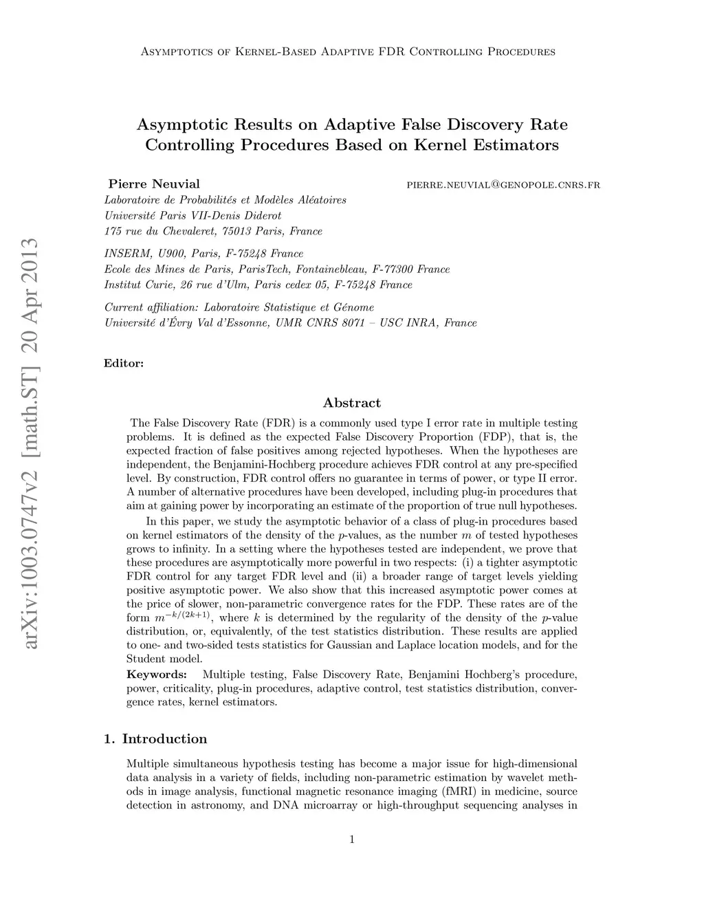 The False Discovery Rate (FDR) is a commonly used type I error rate in multiple testing problems. It is defined as the expected False Discovery Proportion (FDP), that is, the expected fraction of false positives among rejected hypotheses. When the hypotheses are independent, the Benjamini-Hochberg procedure achieves FDR control at any pre-specified level. By construction, FDR control offers no guarantee in terms of power, or type II error. A number of alternative procedures have been developed, including plug-in procedures that aim at gaining power by incorporating an estimate of the proportion of true null hypotheses. In this paper, we study the asymptotic behavior of a class of plug-in procedures based on kernel estimators of the density of the -values, as the number of tested hypotheses grows to infinity. In a setting where the hypotheses tested are independent, we prove that these procedures are asymptotically more powerful in two respects: (i) a tighter asymptotic FDR control for any target FDR level and (ii) a broader range of target levels yielding positive asymptotic power. We also show that this increased asymptotic power comes at the price of slower, non-parametric convergence rates for the FDP. These rates are of the form , where is determined by the regularity of the density of the -value distribution, or, equivalently, of the test statistics distribution. These results are applied to one- and two-sided tests statistics for Gaussian and Laplace location models, and for the Student model.