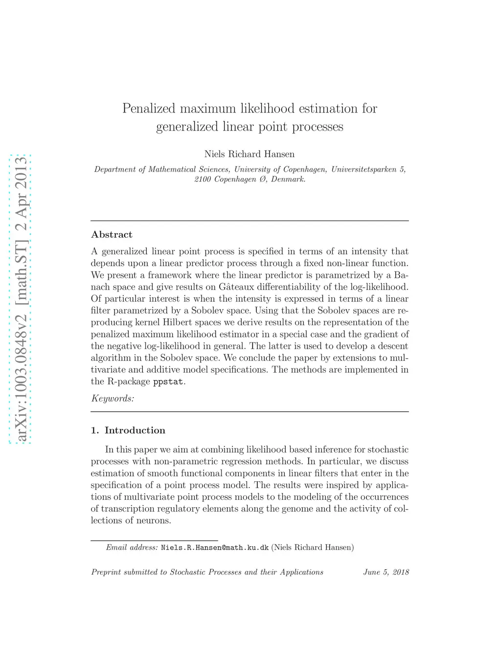 A generalized linear point process is specified in terms of an intensity that depends upon a linear predictor process through a fixed non-linear function. We present a framework where the linear predictor is parametrized by a Banach space and give results on Gateaux differentiability of the log-likelihood. Of particular interest is when the intensity is expressed in terms of a linear filter parametrized by a Sobolev space. Using that the Sobolev spaces are reproducing kernel Hilbert spaces we derive results on the representation of the penalized maximum likelihood estimator in a special case and the gradient of the negative log-likelihood in general. The latter is used to develop a descent algorithm in the Sobolev space. We conclude the paper by extensions to multivariate and additive model specifications. The methods are implemented in the R-package ppstat.