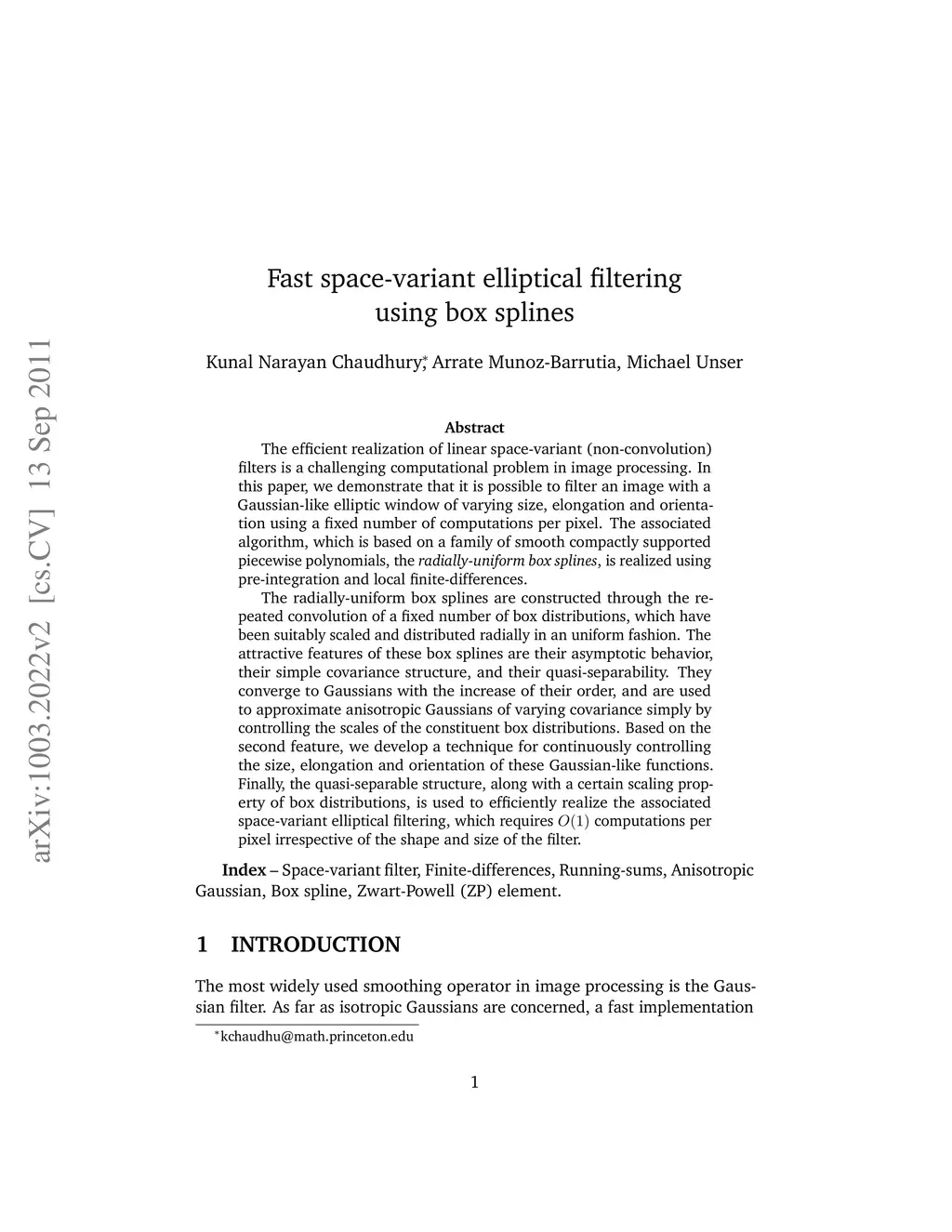 The efficient realization of linear space-variant (non-convolution) filters is a challenging computational problem in image processing. In this paper, we demonstrate that it is possible to filter an image with a Gaussian-like elliptic window of varying size, elongation and orientation using a fixed number of computations per pixel. The associated algorithm, which is based on a family of smooth compactly supported piecewise polynomials, the radially-uniform box splines, is realized using pre-integration and local finite-differences. The radially-uniform box splines are constructed through the repeated convolution of a fixed number of box distributions, which have been suitably scaled and distributed radially in an uniform fashion. The attractive features of these box splines are their asymptotic behavior, their simple covariance structure, and their quasi-separability. They converge to Gaussians with the increase of their order, and are used to approximate anisotropic Gaussians of varying covariance simply by controlling the scales of the constituent box distributions. Based on the second feature, we develop a technique for continuously controlling the size, elongation and orientation of these Gaussian-like functions. Finally, the quasi-separable structure, along with a certain scaling property of box distributions, is used to efficiently realize the associated space-variant elliptical filtering, which requires O(1) computations per pixel irrespective of the shape and size of the filter.