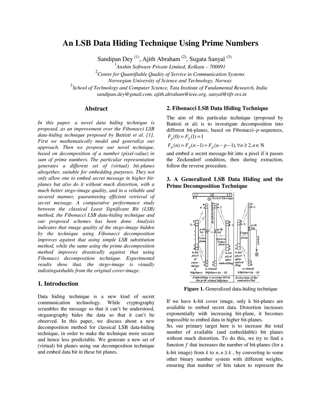 In this paper, a novel data hiding technique is proposed, as an improvement over the Fibonacci LSB data-hiding technique proposed by Battisti et al. First we mathematically model and generalize our approach. Then we propose our novel technique, based on decomposition of a number (pixel-value) in sum of prime numbers. The particular representation generates a different set of (virtual) bit-planes altogether, suitable for embedding purposes. They not only allow one to embed secret message in higher bit-planes but also do it without much distortion, with a much better stego-image quality, and in a reliable and secured manner, guaranteeing efficient retrieval of secret message. A comparative performance study between the classical Least Significant Bit (LSB)method, the Fibonacci LSB data-hiding technique and our proposed schemes has been done. Analysis indicates that image quality of the stego-image hidden by the technique using Fibonacci decomposition improves against that using simple LSB substitution method, while the same using the prime decomposition method improves drastically against that using Fibonacci decomposition technique. Experimental results show that, the stego-image is visually indistinguishable from the original cover-image.