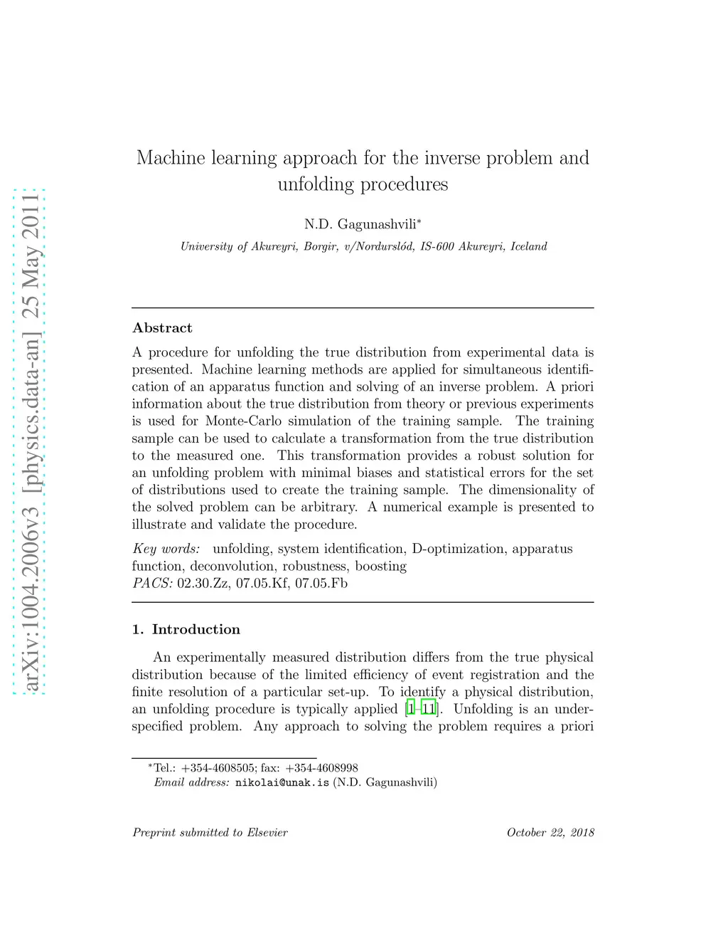A procedure for unfolding the true distribution from experimental data is presented. Machine learning methods are applied for simultaneous identification of an apparatus function and solving of an inverse problem. A priori information about the true distribution from theory or previous experiments is used for Monte-Carlo simulation of the training sample. The training sample can be used to calculate a transformation from the true distribution to the measured one. This transformation provides a robust solution for an unfolding problem with minimal biases and statistical errors for the set of distributions used to create the training sample. The dimensionality of the solved problem can be arbitrary. A numerical example is presented to illustrate and validate the procedure.