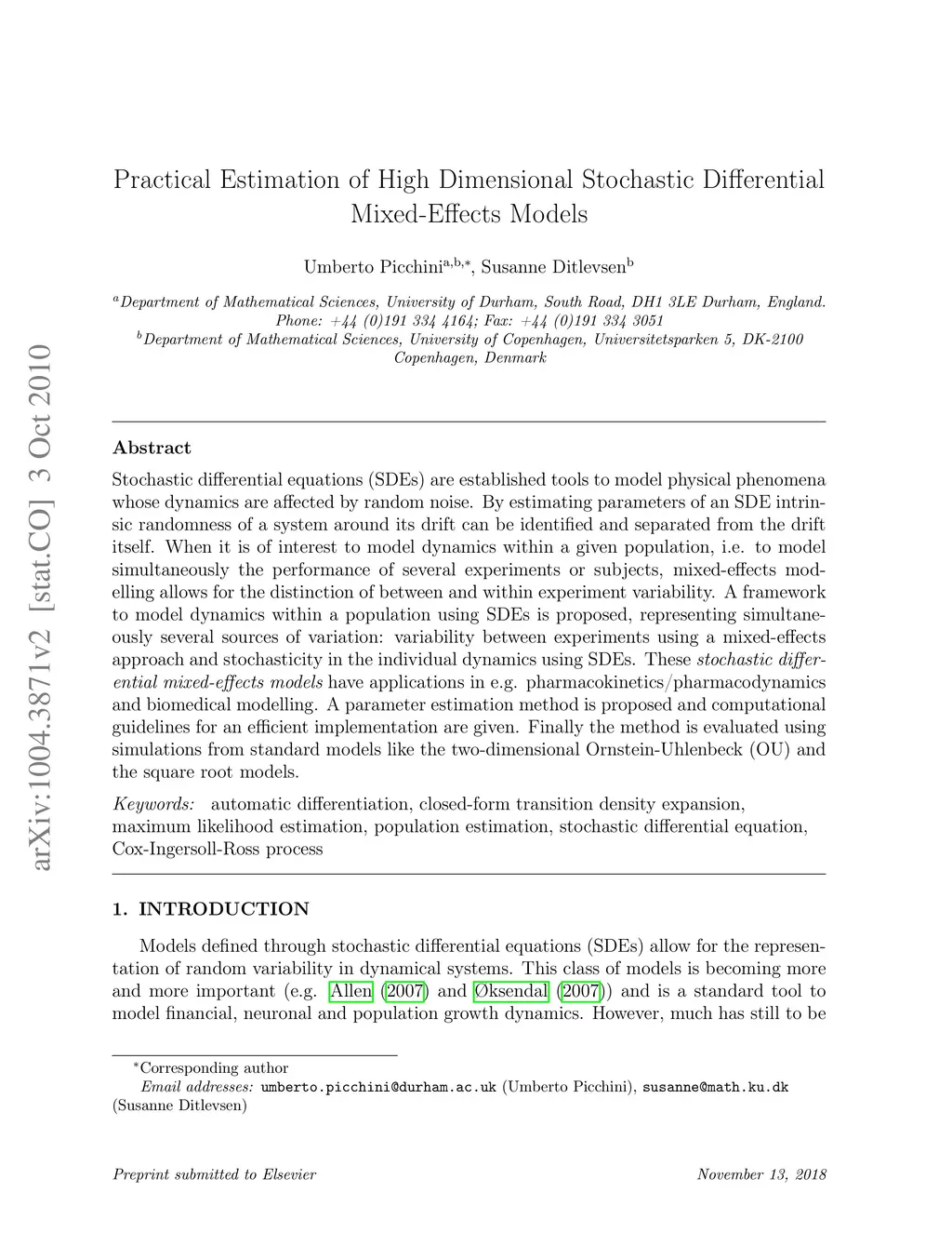 Stochastic differential equations (SDEs) are established tools to model physical phenomena whose dynamics are affected by random noise. By estimating parameters of an SDE intrinsic randomness of a system around its drift can be identified and separated from the drift itself. When it is of interest to model dynamics within a given population, i.e. to model simultaneously the performance of several experiments or subjects, mixed-effects modelling allows for the distinction of between and within experiment variability. A framework to model dynamics within a population using SDEs is proposed, representing simultaneously several sources of variation: variability between experiments using a mixed-effects approach and stochasticity in the individual dynamics using SDEs. These "stochastic differential mixed-effects models" have applications in e.g. pharmacokinetics/pharmacodynamics and biomedical modelling. A parameter estimation method is proposed and computational guidelines for an efficient implementation are given. Finally the method is evaluated using simulations from standard models like the two-dimensional Ornstein-Uhlenbeck (OU) and the square root models.