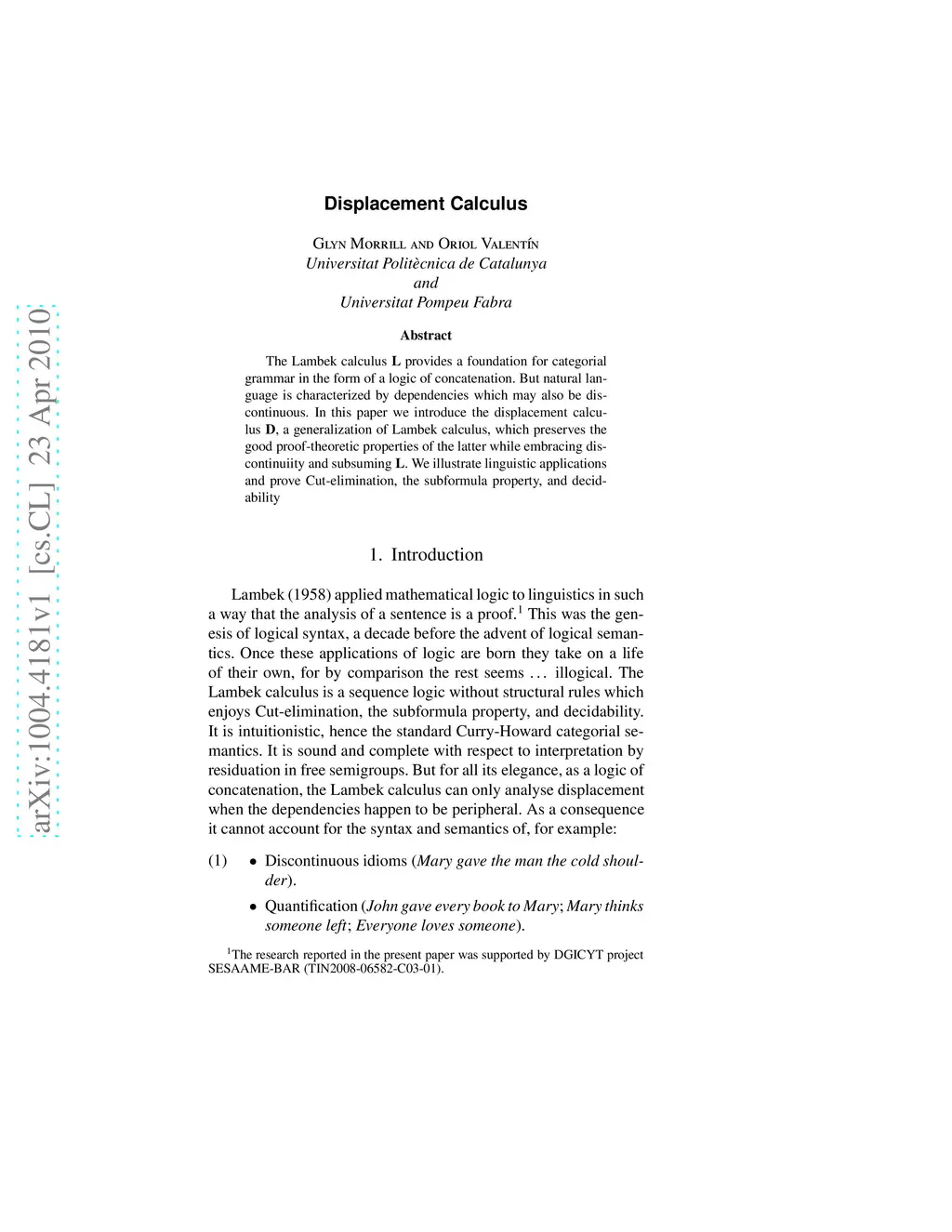 The Lambek calculus provides a foundation for categorial grammar in the form of a logic of concatenation. But natural language is characterized by dependencies which may also be discontinuous. In this paper we introduce the displacement calculus, a generalization of Lambek calculus, which preserves its good proof-theoretic properties while embracing discontinuiity and subsuming it. We illustrate linguistic applications and prove Cut-elimination, the subformula property, and decidability