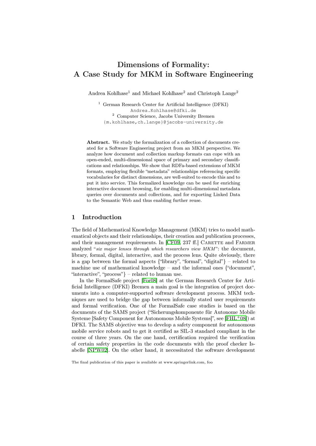 Dimensions of Formality: A Case Study for MKM in Software Engineering