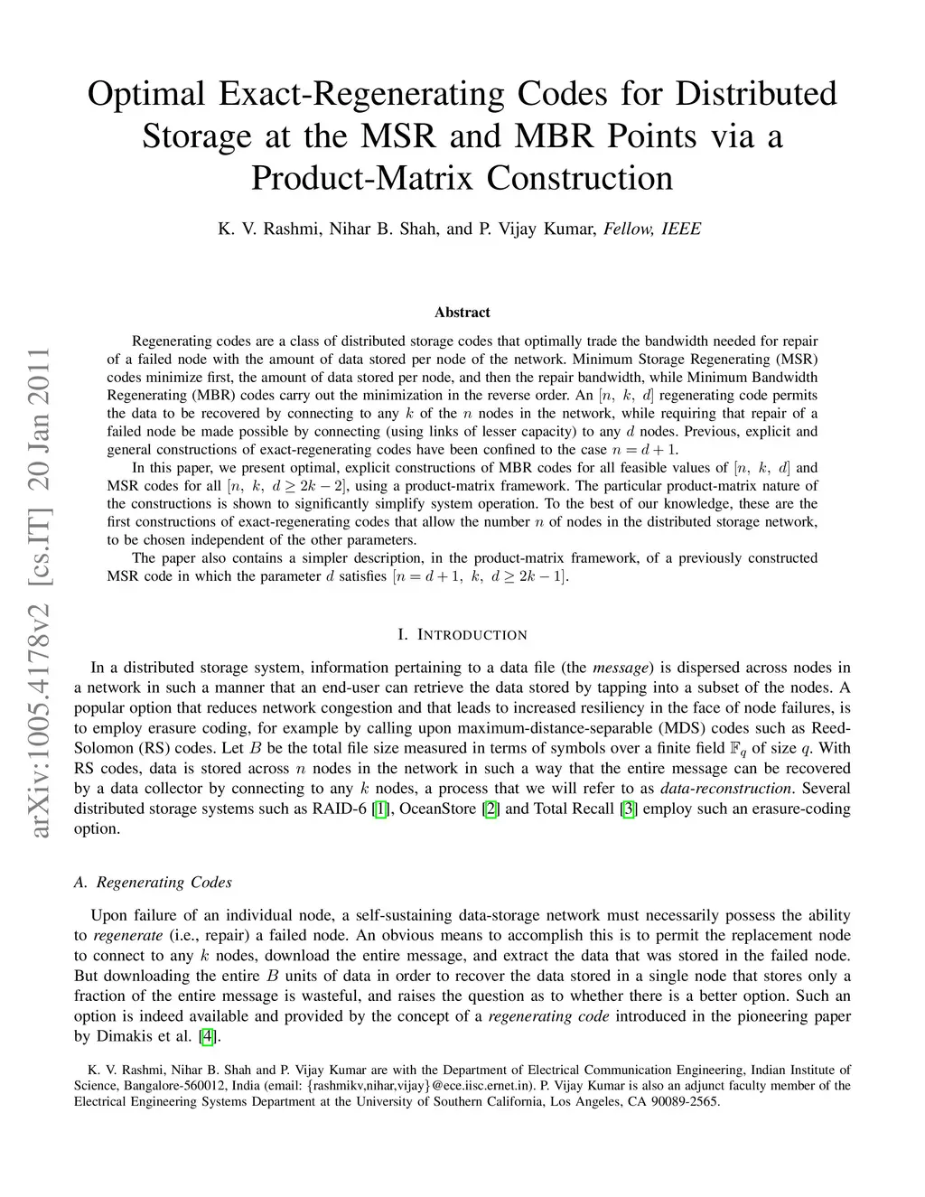 Regenerating codes are a class of distributed storage codes that optimally trade the bandwidth needed for repair of a failed node with the amount of data stored per node of the network. Minimum Storage Regenerating (MSR) codes minimize first, the amount of data stored per node, and then the repair bandwidth, while Minimum Bandwidth Regenerating (MBR) codes carry out the minimization in the reverse order. An [n, k, d] regenerating code permits the data to be recovered by connecting to any k of the n nodes in the network, while requiring that repair of a failed node be made possible by connecting (using links of lesser capacity) to any d nodes. Previous, explicit and general constructions of exact-regenerating codes have been confined to the case n=d+1. In this paper, we present optimal, explicit constructions of MBR codes for all feasible values of [n, k, d] and MSR codes for all [n, k, d >= 2k-2], using a product-matrix framework. The particular product-matrix nature of the constructions is shown to significantly simplify system operation. To the best of our knowledge, these are the first constructions of exact-regenerating codes that allow the number n of nodes in the distributed storage network, to be chosen independent of the other parameters. The paper also contains a simpler description, in the product-matrix framework, of a previously constructed MSR code in which the parameter d satisfies [n=d+1, k, d >= 2k-1].