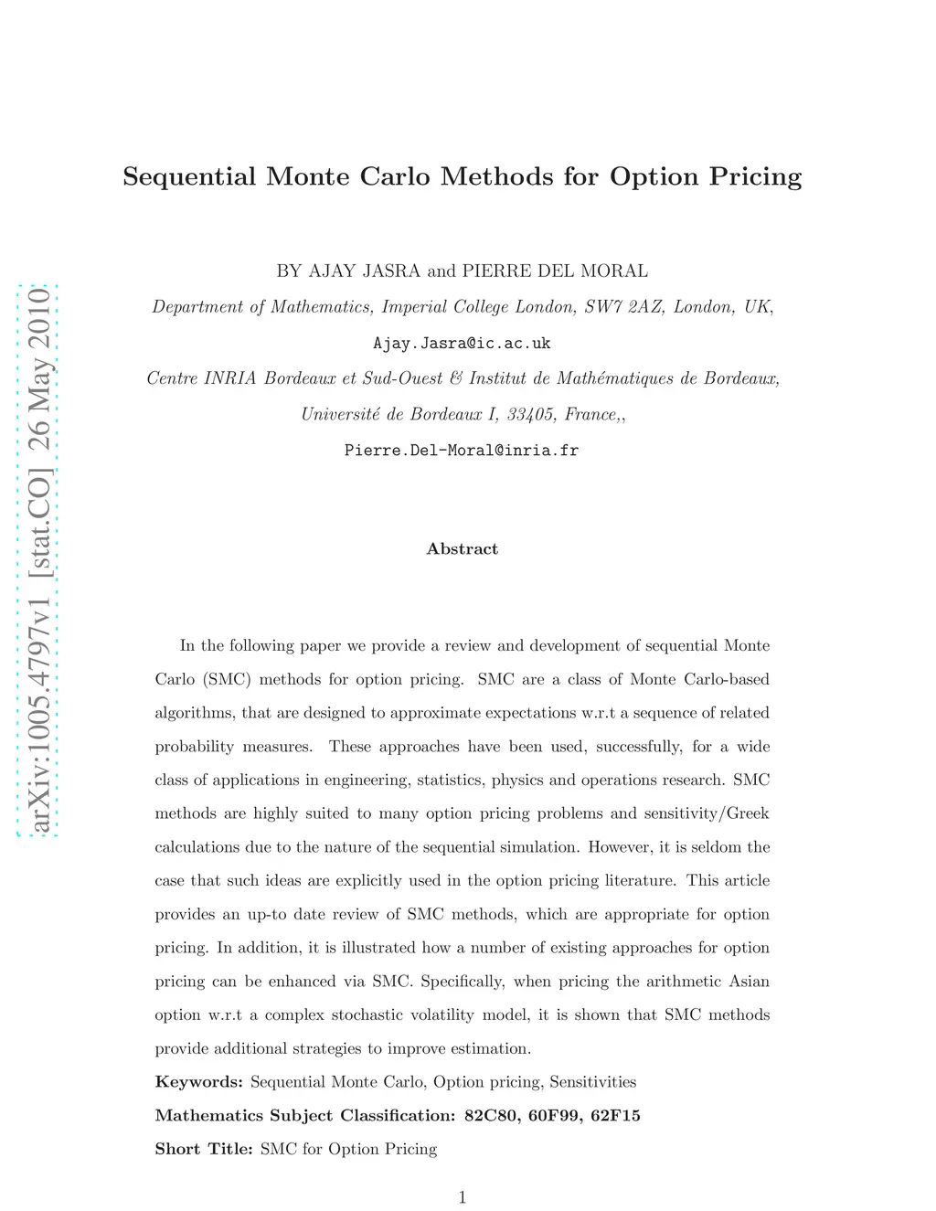 In the following paper we provide a review and development of sequential Monte Carlo (SMC) methods for option pricing. SMC are a class of Monte Carlo-based algorithms, that are designed to approximate expectations w.r.t a sequence of related probability measures. These approaches have been used, successfully, for a wide class of applications in engineering, statistics, physics and operations research. SMC methods are highly suited to many option pricing problems and sensitivity/Greek calculations due to the nature of the sequential simulation. However, it is seldom the case that such ideas are explicitly used in the option pricing literature. This article provides an up-to date review of SMC methods, which are appropriate for option pricing. In addition, it is illustrated how a number of existing approaches for option pricing can be enhanced via SMC. Specifically, when pricing the arithmetic Asian option w.r.t a complex stochastic volatility model, it is shown that SMC methods provide additional strategies to improve estimation.