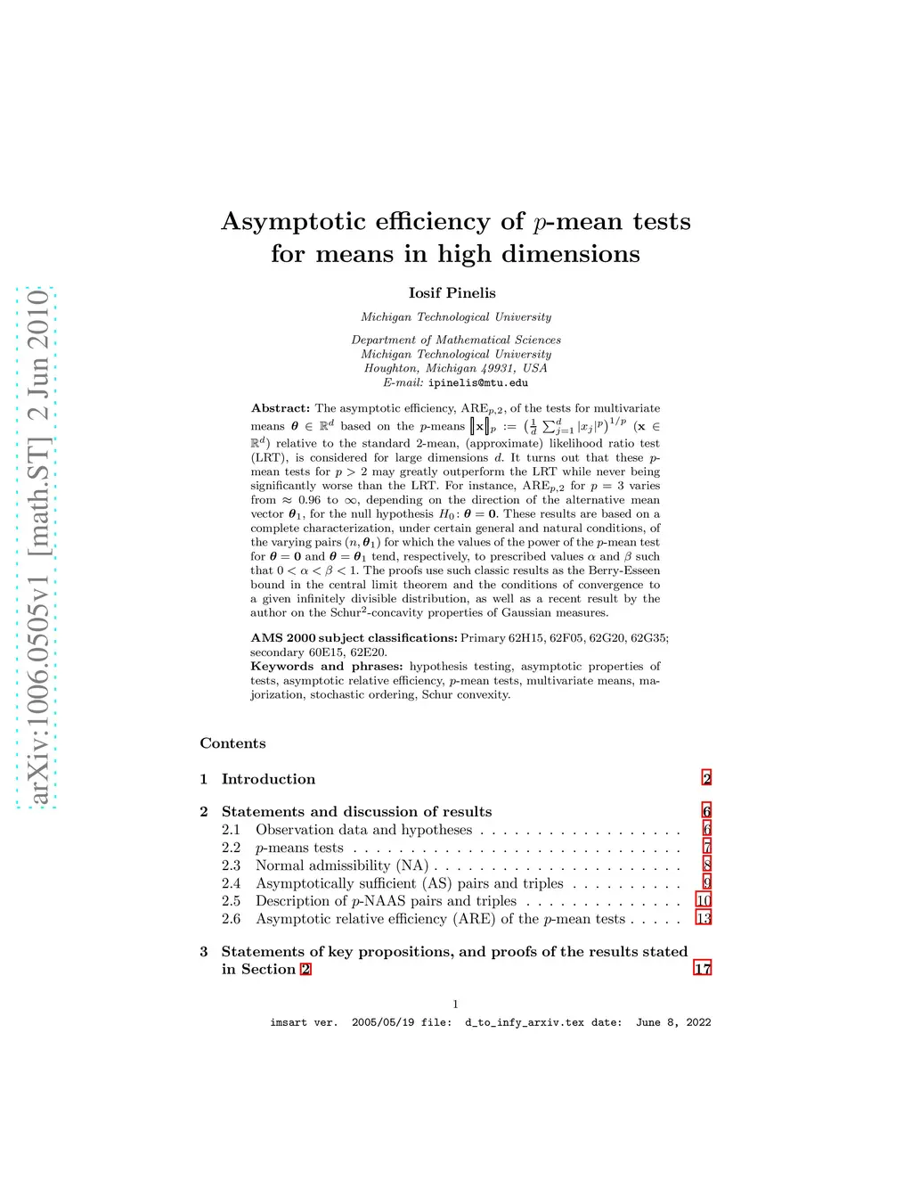 The asymptotic efficiency, ARE_{p,2}, of the tests for multivariate means theta in \R^d based on the p-means relative to the standard 2-mean, (approximate) likelihood ratio test (LRT), is considered for large dimensions d. It turns out that these p-mean tests for p>2 may greatly outperform the LRT while never being significantly worse than the LRT. For instance, ARE_{p,2} for p=3 varies from about 0.96 to \infty, depending on the direction of the alternative mean vector theta_1, for the null hypothesis H_0: theta=\0. These results are based on a complete characterization, under certain general and natural conditions, of the varying pairs (n,theta_1) for which the values of the power of the p-mean test for theta=\0 and theta=theta_1 tend, respectively, to prescribed values alpha and beta. The proofs use such classic results as the Berry-Esseen bound in the central limit theorem and the conditions of convergence to a given infinitely divisible distribution, as well as a recent result by the author on the Schur^2-concavity properties of Gaussian measures.