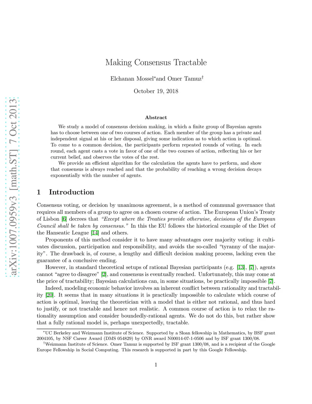 We study a model of consensus decision making, in which a finite group of Bayesian agents has to choose between one of two courses of action. Each member of the group has a private and independent signal at his or her disposal, giving some indication as to which action is optimal. To come to a common decision, the participants perform repeated rounds of voting. In each round, each agent casts a vote in favor of one of the two courses of action, reflecting his or her current belief, and observes the votes of the rest. We provide an efficient algorithm for the calculation the agents have to perform, and show that consensus is always reached and that the probability of reaching a wrong decision decays exponentially with the number of agents.