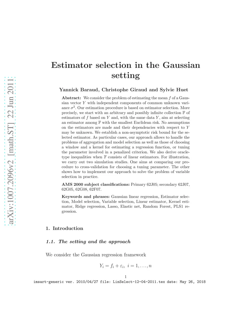 We consider the problem of estimating the mean of a Gaussian vector with independent components of common unknown variance . Our estimation procedure is based on estimator selection. More precisely, we start with an arbitrary and possibly infinite collection of estimators of based on and, with the same data , aim at selecting an estimator among with the smallest Euclidean risk. No assumptions on the estimators are made and their dependencies with respect to may be unknown. We establish a non-asymptotic risk bound for the selected estimator. As particular cases, our approach allows to handle the problems of aggregation and model selection as well as those of choosing a window and a kernel for estimating a regression function, or tuning the parameter involved in a penalized criterion. We also derive oracle-type inequalities when consists of linear estimators. For illustration, we carry out two simulation studies. One aims at comparing our procedure to cross-validation for choosing a tuning parameter. The other shows how to implement our approach to solve the problem of variable selection in practice.