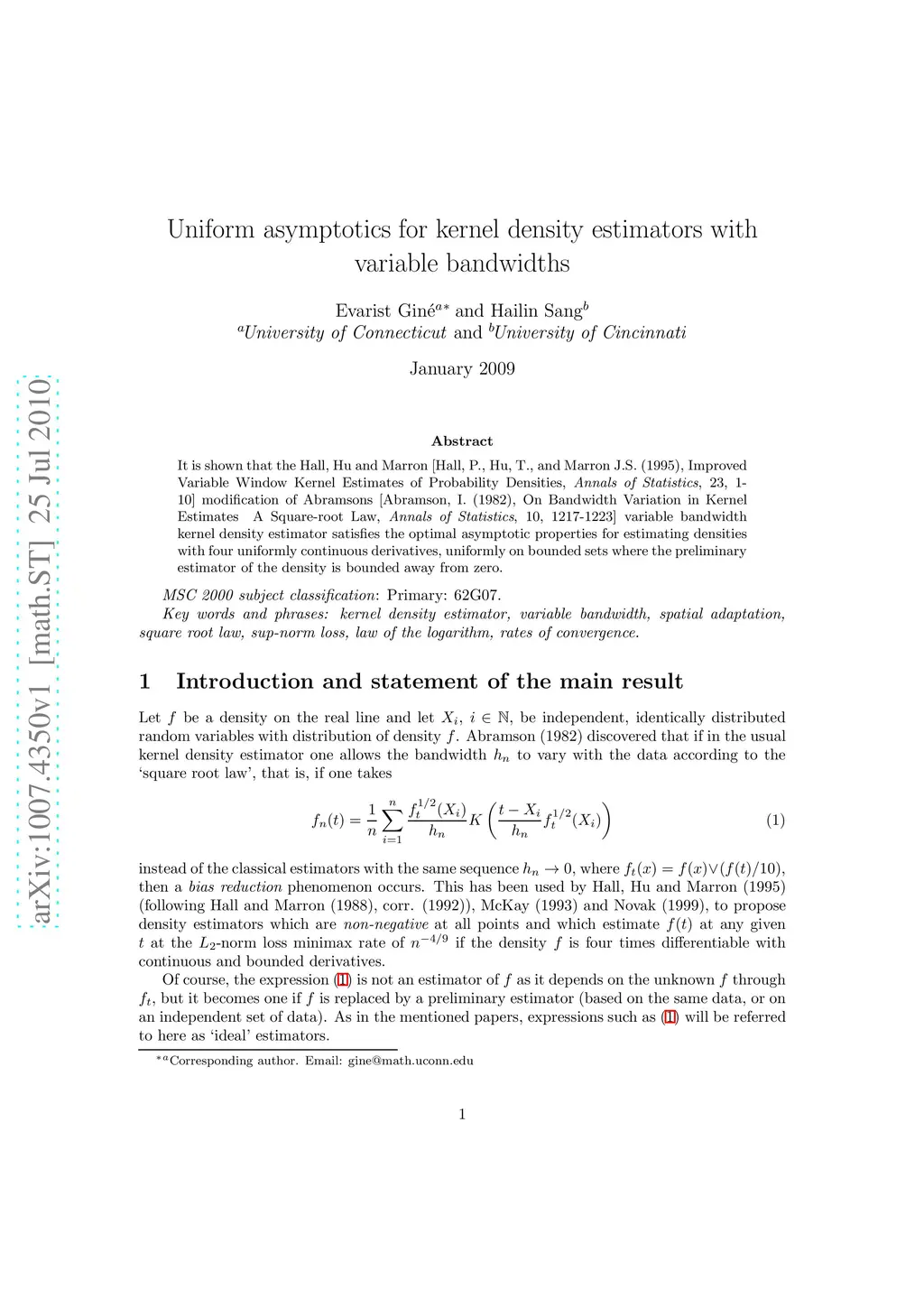 It is shown that the Hall, Hu and Marron [Hall, P., Hu, T., and Marron J.S. (1995), Improved Variable Window Kernel Estimates of Probability Densities, {\it Annals of Statistics}, 23, 1--10] modification of Abramson's [Abramson, I. (1982), On Bandwidth Variation in Kernel Estimates - A Square-root Law, {\it Annals of Statistics}, 10, 1217--1223] variable bandwidth kernel density estimator satisfies the optimal asymptotic properties for estimating densities with four uniformly continuous derivatives, uniformly on bounded sets where the preliminary estimator of the density is bounded away from zero.