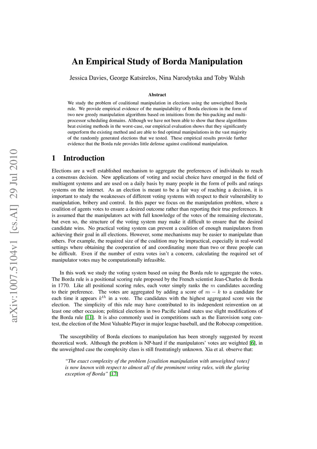 We study the problem of coalitional manipulation in elections using the unweighted Borda rule. We provide empirical evidence of the manipulability of Borda elections in the form of two new greedy manipulation algorithms based on intuitions from the bin-packing and multiprocessor scheduling domains. Although we have not been able to show that these algorithms beat existing methods in the worst-case, our empirical evaluation shows that they significantly outperform the existing method and are able to find optimal manipulations in the vast majority of the randomly generated elections that we tested. These empirical results provide further evidence that the Borda rule provides little defense against coalitional manipulation.