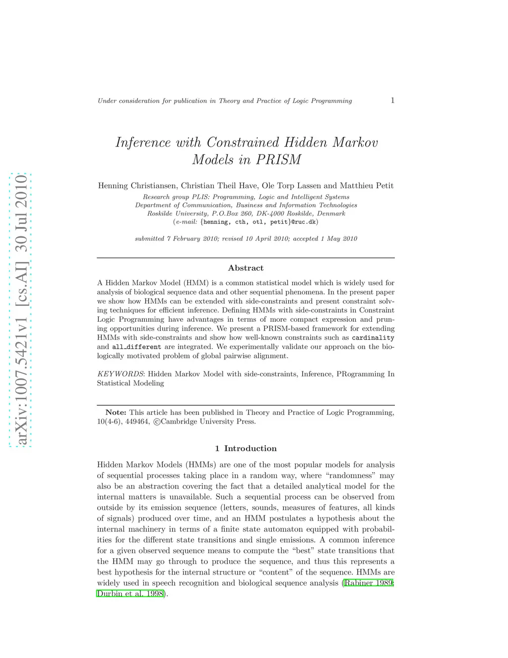 A Hidden Markov Model (HMM) is a common statistical model which is widely used for analysis of biological sequence data and other sequential phenomena. In the present paper we show how HMMs can be extended with side-constraints and present constraint solving techniques for efficient inference. Defining HMMs with side-constraints in Constraint Logic Programming have advantages in terms of more compact expression and pruning opportunities during inference. We present a PRISM-based framework for extending HMMs with side-constraints and show how well-known constraints such as cardinality and all different are integrated. We experimentally validate our approach on the biologically motivated problem of global pairwise alignment.