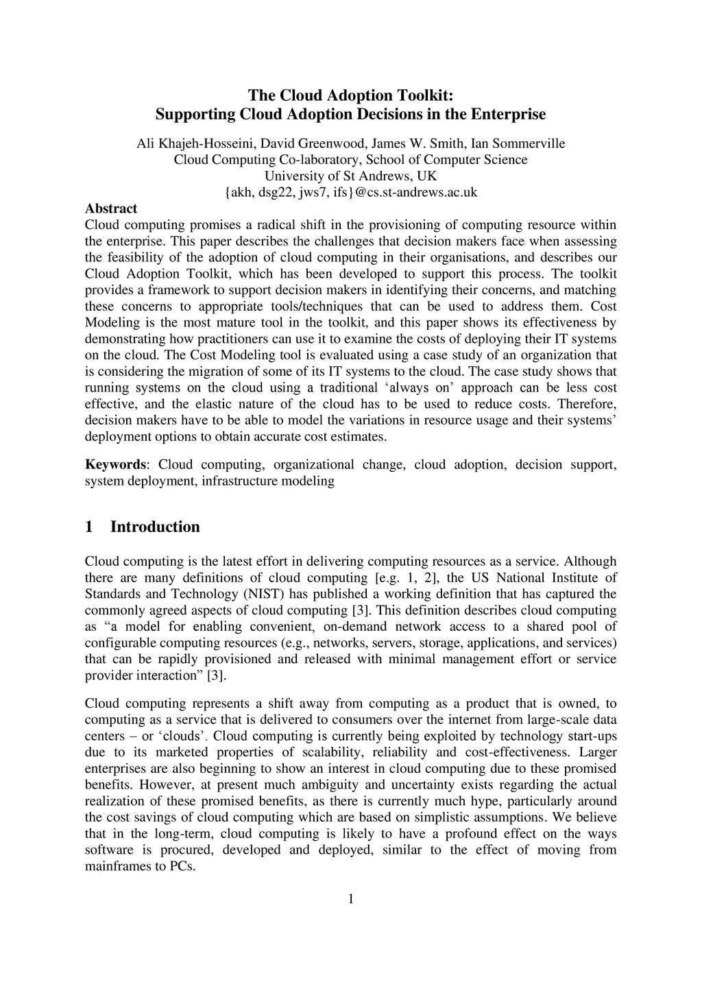 Cloud computing promises a radical shift in the provisioning of computing resource within the enterprise. This paper describes the challenges that decision makers face when assessing the feasibility of the adoption of cloud computing in their organisations, and describes our Cloud Adoption Toolkit, which has been developed to support this process. The toolkit provides a framework to support decision makers in identifying their concerns, and matching these concerns to appropriate tools/techniques that can be used to address them. Cost Modeling is the most mature tool in the toolkit, and this paper shows its effectiveness by demonstrating how practitioners can use it to examine the costs of deploying their IT systems on the cloud. The Cost Modeling tool is evaluated using a case study of an organization that is considering the migration of some of its IT systems to the cloud. The case study shows that running systems on the cloud using a traditional "always on" approach can be less cost effective, and the elastic nature of the cloud has to be used to reduce costs. Therefore, decision makers have to be able to model the variations in resource usage and their systems deployment options to obtain accurate cost estimates.