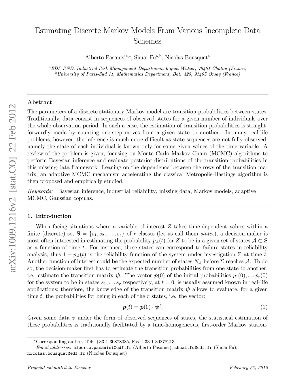 The parameters of a discrete stationary Markov model are transition probabilities between states. Traditionally, data consist in sequences of observed states for a given number of individuals over the whole observation period. In such a case, the estimation of transition probabilities is straightforwardly made by counting one-step moves from a given state to another. In many real-life problems, however, the inference is much more difficult as state sequences are not fully observed, namely the state of each individual is known only for some given values of the time variable. A review of the problem is given, focusing on Monte Carlo Markov Chain (MCMC) algorithms to perform Bayesian inference and evaluate posterior distributions of the transition probabilities in this missing-data framework. Leaning on the dependence between the rows of the transition matrix, an adaptive MCMC mechanism accelerating the classical Metropolis-Hastings algorithm is then proposed and empirically studied.