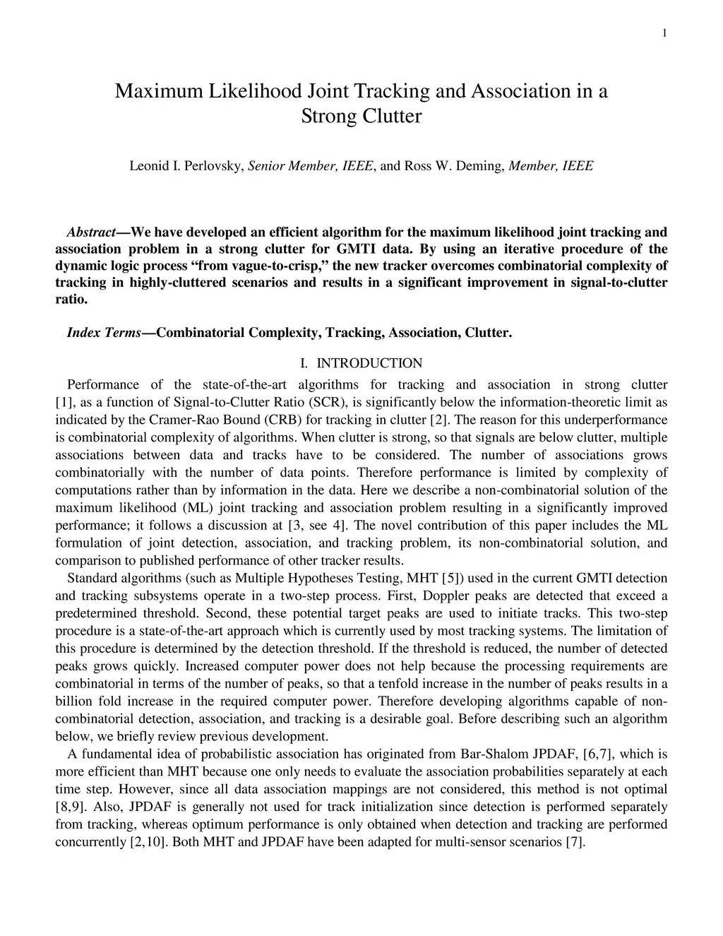 We have developed an efficient algorithm for the maximum likelihood joint tracking and association problem in a strong clutter for GMTI data. By using an iterative procedure of the dynamic logic process "from vague-to-crisp," the new tracker overcomes combinatorial complexity of tracking in highly-cluttered scenarios and results in a significant improvement in signal-to-clutter ratio.