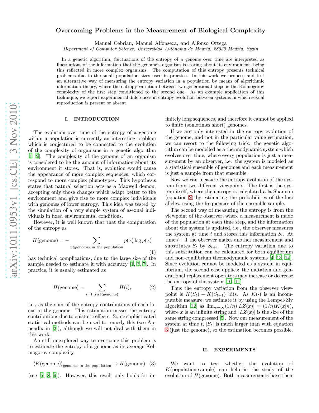 In a genetic algorithm, fluctuations of the entropy of a genome over time are interpreted as fluctuations of the information that the genome's organism is storing about its environment, being this reflected in more complex organisms. The computation of this entropy presents technical problems due to the small population sizes used in practice. In this work we propose and test an alternative way of measuring the entropy variation in a population by means of algorithmic information theory, where the entropy variation between two generational steps is the Kolmogorov complexity of the first step conditioned to the second one. As an example application of this technique, we report experimental differences in entropy evolution between systems in which sexual reproduction is present or absent.