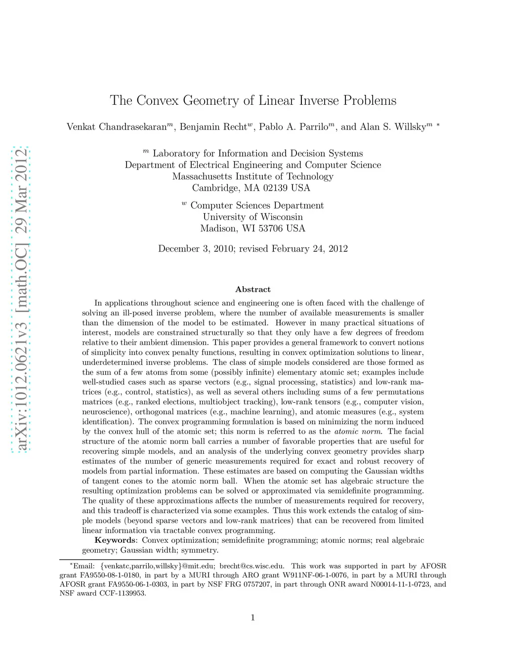 In applications throughout science and engineering one is often faced with the challenge of solving an ill-posed inverse problem, where the number of available measurements is smaller than the dimension of the model to be estimated. However in many practical situations of interest, models are constrained structurally so that they only have a few degrees of freedom relative to their ambient dimension. This paper provides a general framework to convert notions of simplicity into convex penalty functions, resulting in convex optimization solutions to linear, underdetermined inverse problems. The class of simple models considered are those formed as the sum of a few atoms from some (possibly infinite) elementary atomic set; examples include well-studied cases such as sparse vectors and low-rank matrices, as well as several others including sums of a few permutations matrices, low-rank tensors, orthogonal matrices, and atomic measures. The convex programming formulation is based on minimizing the norm induced by the convex hull of the atomic set; this norm is referred to as the atomic norm. The facial structure of the atomic norm ball carries a number of favorable properties that are useful for recovering simple models, and an analysis of the underlying convex geometry provides sharp estimates of the number of generic measurements required for exact and robust recovery of models from partial information. These estimates are based on computing the Gaussian widths of tangent cones to the atomic norm ball. When the atomic set has algebraic structure the resulting optimization problems can be solved or approximated via semidefinite programming. The quality of these approximations affects the number of measurements required for recovery. Thus this work extends the catalog of simple models that can be recovered from limited linear information via tractable convex programming.