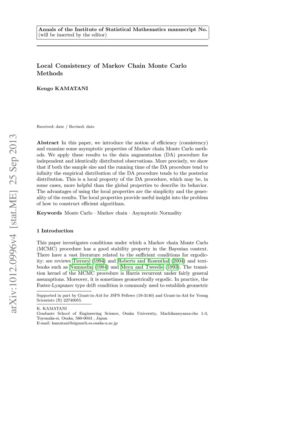 In this paper, we introduce the notion of efficiency (consistency) and examine some asymptotic properties of Markov chain Monte Carlo methods. We apply these results to the data augmentation (DA) procedure for independent and identically distributed observations. More precisely, we show that if both the sample size and the running time of the DA procedure tend to infinity the empirical distribution of the DA procedure tends to the posterior distribution. This is a local property of the DA procedure, which may be, in some cases, more helpful than the global properties to describe its behavior. The advantages of using the local properties are the simplicity and the generality of the results. The local properties provide useful insight into the problem of how to construct efficient algorithms.
