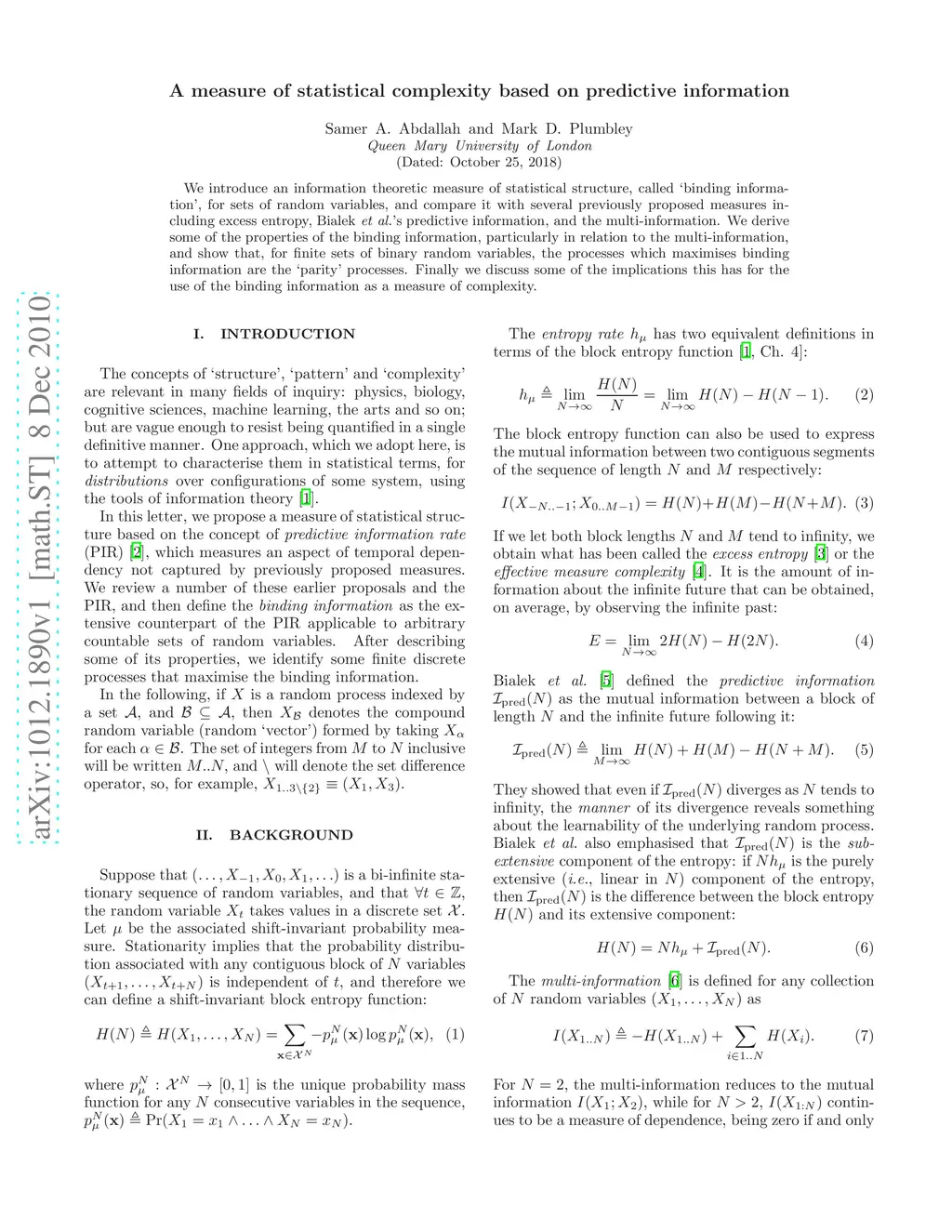 We introduce an information theoretic measure of statistical structure, called 'binding information', for sets of random variables, and compare it with several previously proposed measures including excess entropy, Bialek et al.'s predictive information, and the multi-information. We derive some of the properties of the binding information, particularly in relation to the multi-information, and show that, for finite sets of binary random variables, the processes which maximises binding information are the 'parity' processes. Finally we discuss some of the implications this has for the use of the binding information as a measure of complexity.