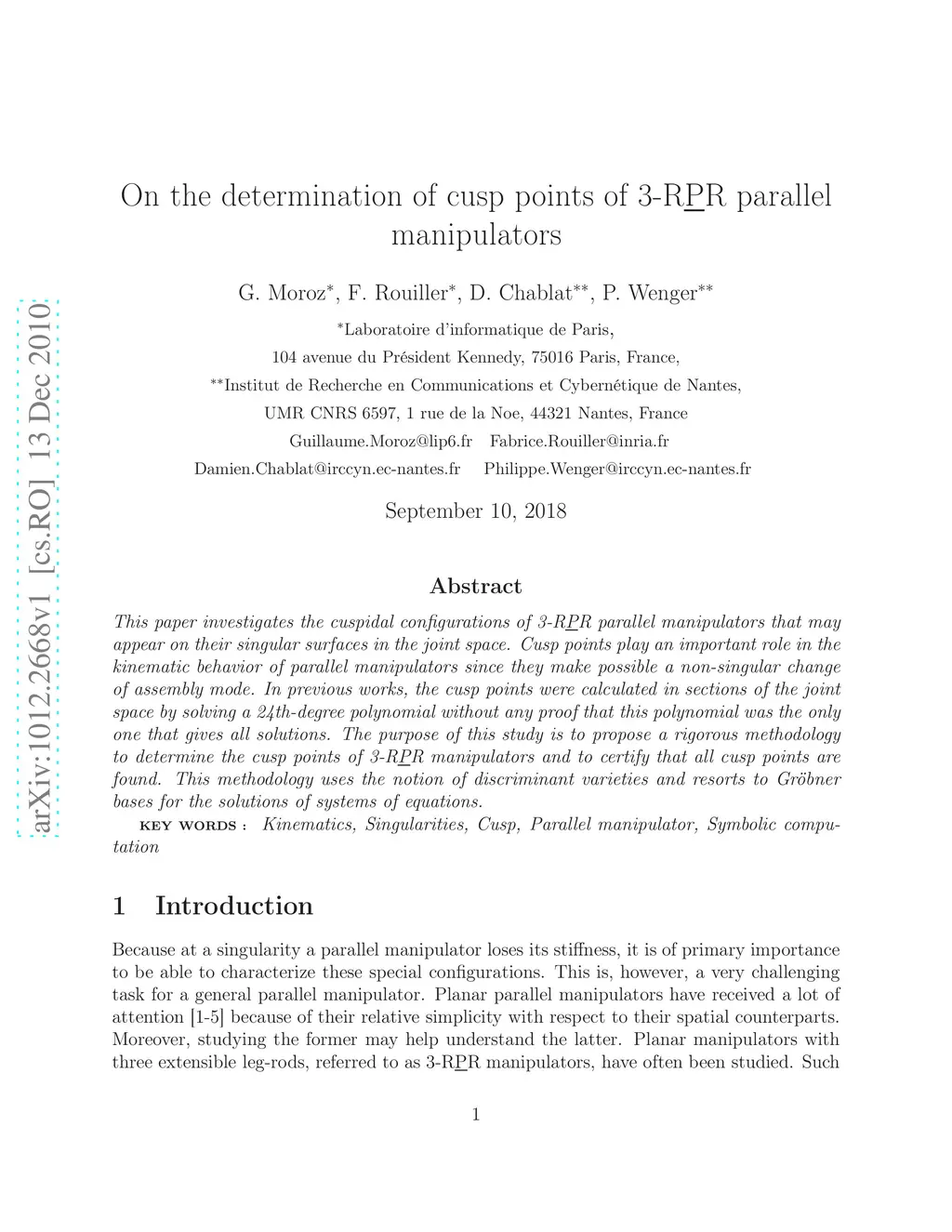 This paper investigates the cuspidal configurations of 3-RPR parallel manipulators that may appear on their singular surfaces in the joint space. Cusp points play an important role in the kinematic behavior of parallel manipulators since they make possible a non-singular change of assembly mode. In previous works, the cusp points were calculated in sections of the joint space by solving a 24th-degree polynomial without any proof that this polynomial was the only one that gives all solutions. The purpose of this study is to propose a rigorous methodology to determine the cusp points of 3-R\underline{P}R manipulators and to certify that all cusp points are found. This methodology uses the notion of discriminant varieties and resorts to Gr\"obner bases for the solutions of systems of equations.