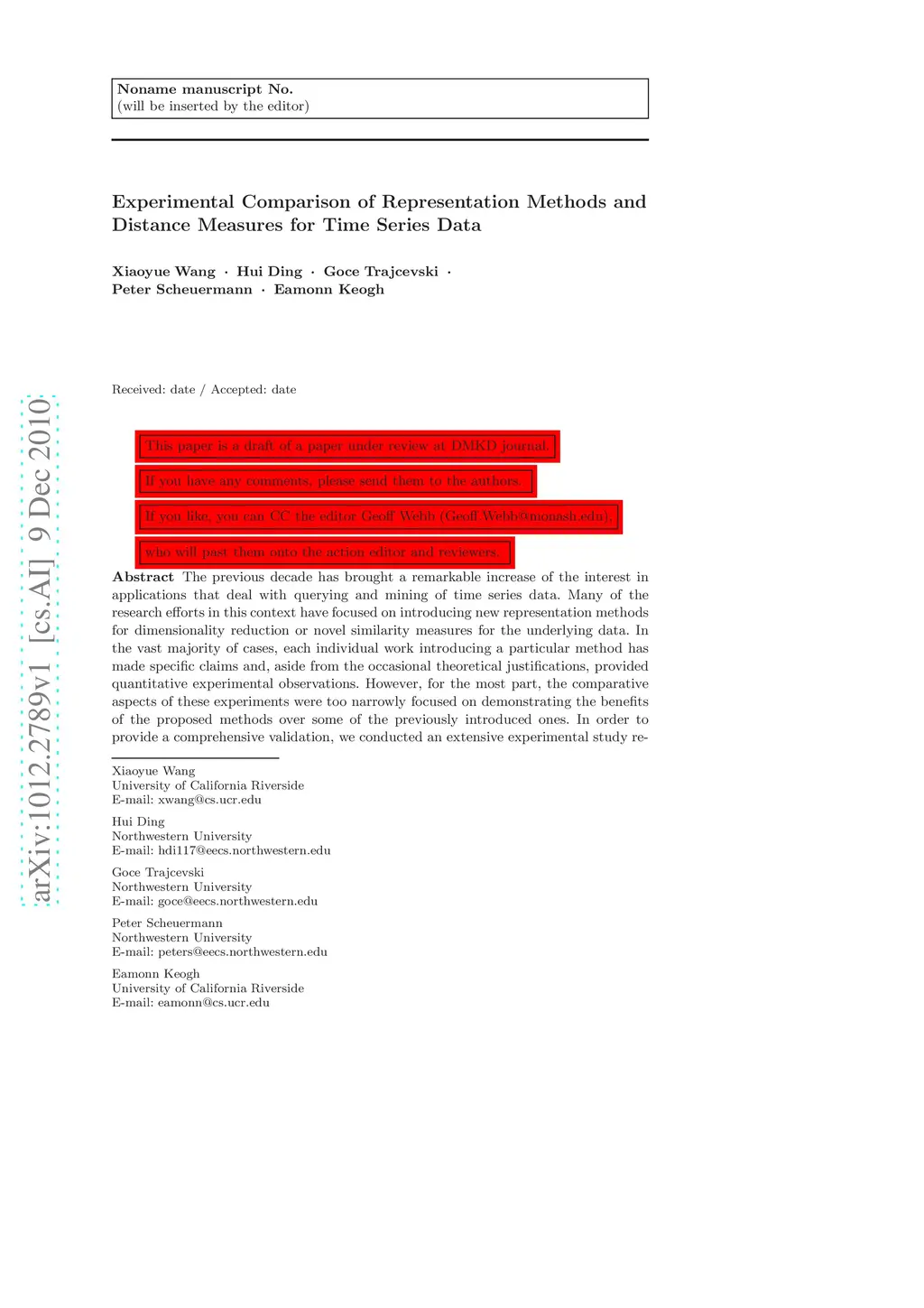 The previous decade has brought a remarkable increase of the interest in applications that deal with querying and mining of time series data. Many of the research efforts in this context have focused on introducing new representation methods for dimensionality reduction or novel similarity measures for the underlying data. In the vast majority of cases, each individual work introducing a particular method has made specific claims and, aside from the occasional theoretical justifications, provided quantitative experimental observations. However, for the most part, the comparative aspects of these experiments were too narrowly focused on demonstrating the benefits of the proposed methods over some of the previously introduced ones. In order to provide a comprehensive validation, we conducted an extensive experimental study re-implementing eight different time series representations and nine similarity measures and their variants, and testing their effectiveness on thirty-eight time series data sets from a wide variety of application domains. In this paper, we give an overview of these different techniques and present our comparative experimental findings regarding their effectiveness. In addition to providing a unified validation of some of the existing achievements, our experiments also indicate that, in some cases, certain claims in the literature may be unduly optimistic.