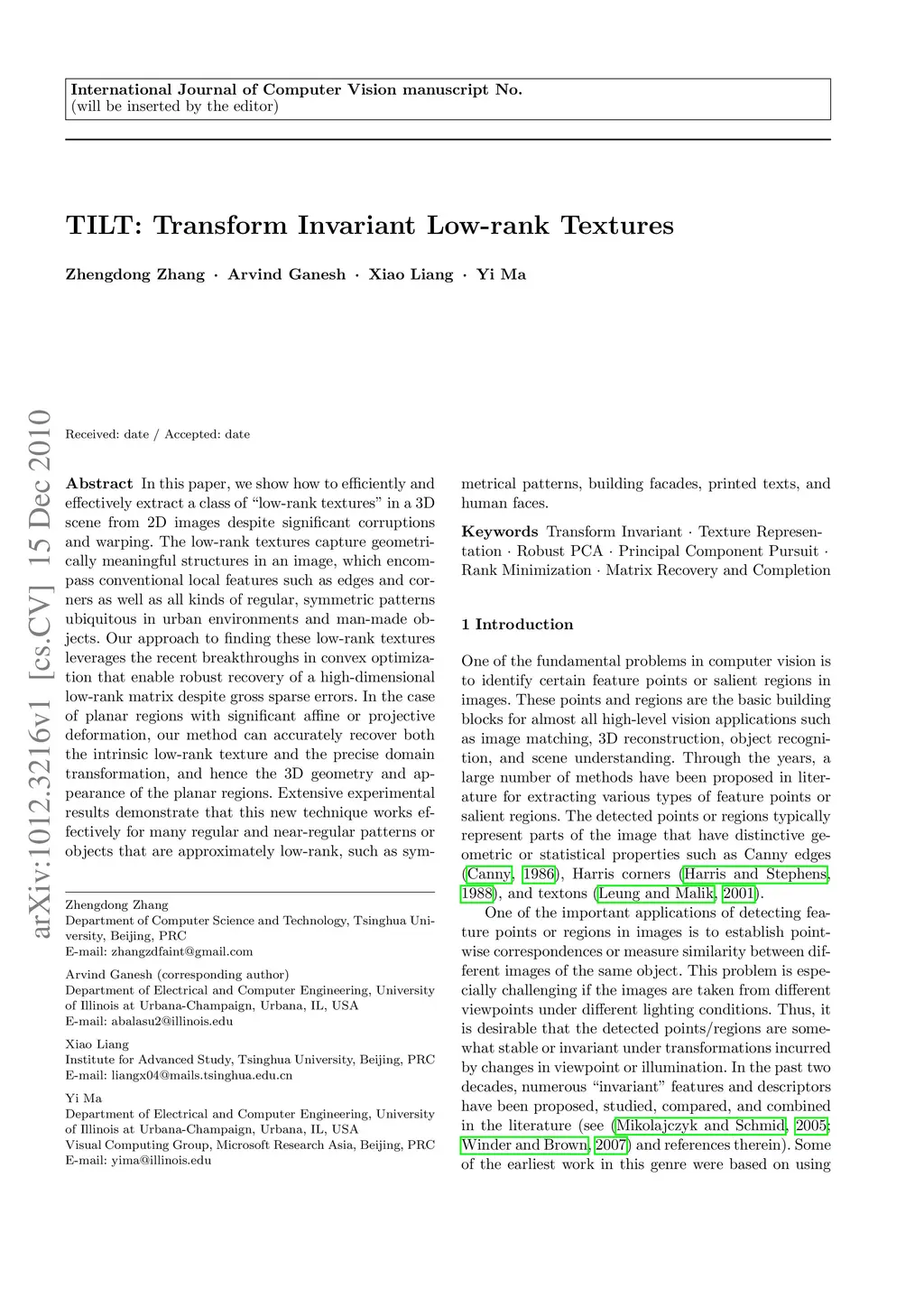 In this paper, we show how to efficiently and effectively extract a class of "low-rank textures" in a 3D scene from 2D images despite significant corruptions and warping. The low-rank textures capture geometrically meaningful structures in an image, which encompass conventional local features such as edges and corners as well as all kinds of regular, symmetric patterns ubiquitous in urban environments and man-made objects. Our approach to finding these low-rank textures leverages the recent breakthroughs in convex optimization that enable robust recovery of a high-dimensional low-rank matrix despite gross sparse errors. In the case of planar regions with significant affine or projective deformation, our method can accurately recover both the intrinsic low-rank texture and the precise domain transformation, and hence the 3D geometry and appearance of the planar regions. Extensive experimental results demonstrate that this new technique works effectively for many regular and near-regular patterns or objects that are approximately low-rank, such as symmetrical patterns, building facades, printed texts, and human faces.