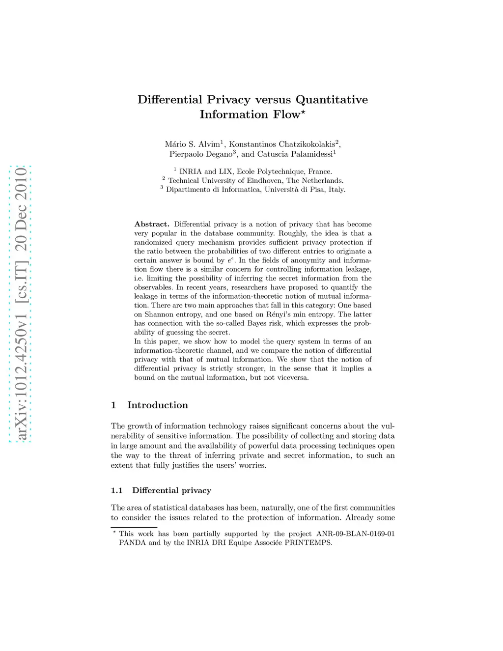 Differential privacy is a notion of privacy that has become very popular in the database community. Roughly, the idea is that a randomized query mechanism provides sufficient privacy protection if the ratio between the probabilities of two different entries to originate a certain answer is bound by e^\epsilon. In the fields of anonymity and information flow there is a similar concern for controlling information leakage, i.e. limiting the possibility of inferring the secret information from the observables. In recent years, researchers have proposed to quantify the leakage in terms of the information-theoretic notion of mutual information. There are two main approaches that fall in this category: One based on Shannon entropy, and one based on R\ényi's min entropy. The latter has connection with the so-called Bayes risk, which expresses the probability of guessing the secret. In this paper, we show how to model the query system in terms of an information-theoretic channel, and we compare the notion of differential privacy with that of mutual information. We show that the notion of differential privacy is strictly stronger, in the sense that it implies a bound on the mutual information, but not viceversa.