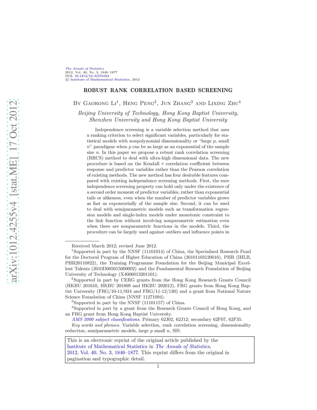 Independence screening is a variable selection method that uses a ranking criterion to select significant variables, particularly for statistical models with nonpolynomial dimensionality or "large p, small n" paradigms when p can be as large as an exponential of the sample size n. In this paper we propose a robust rank correlation screening (RRCS) method to deal with ultra-high dimensional data. The new procedure is based on the Kendall \tau correlation coefficient between response and predictor variables rather than the Pearson correlation of existing methods. The new method has four desirable features compared with existing independence screening methods. First, the sure independence screening property can hold only under the existence of a second order moment of predictor variables, rather than exponential tails or alikeness, even when the number of predictor variables grows as fast as exponentially of the sample size. Second, it can be used to deal with semiparametric models such as transformation regression models and single-index models under monotonic constraint to the link function without involving nonparametric estimation even when there are nonparametric functions in the models. Third, the procedure can be largely used against outliers and influence points in the observations. Last, the use of indicator functions in rank correlation screening greatly simplifies the theoretical derivation due to the boundedness of the resulting statistics, compared with previous studies on variable screening. Simulations are carried out for comparisons with existing methods and a real data example is analyzed.