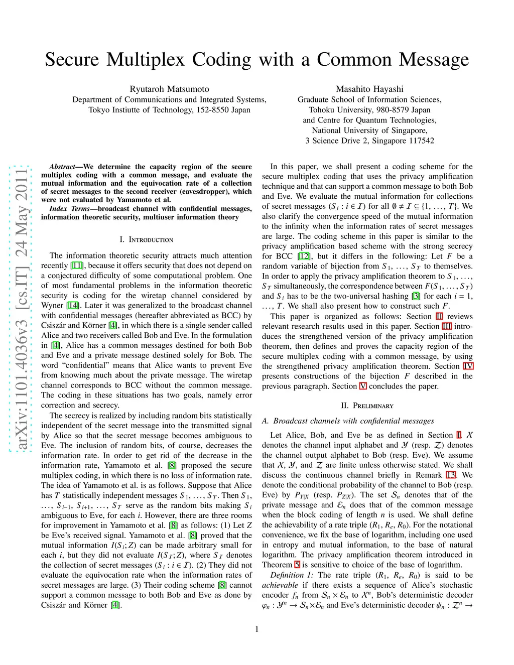We determine the capacity region of the secure multiplex coding with a common message, and evaluate the mutual information and the equivocation rate of a collection of secret messages to the second receiver (eavesdropper), which were not evaluated by Yamamoto et al.
