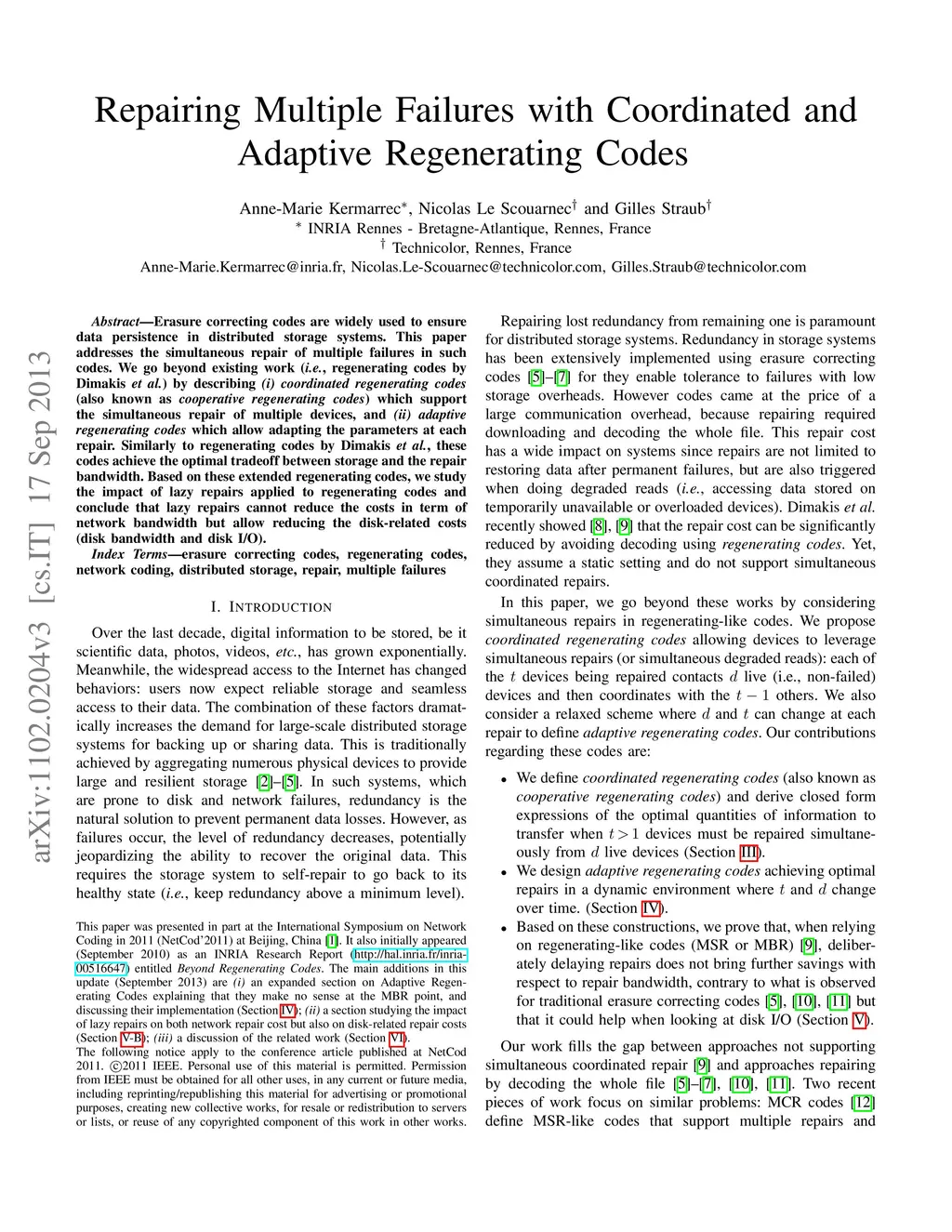 Erasure correcting codes are widely used to ensure data persistence in distributed storage systems. This paper addresses the simultaneous repair of multiple failures in such codes. We go beyond existing work (i.e., regenerating codes by Dimakis et al.) by describing (i) coordinated regenerating codes (also known as cooperative regenerating codes) which support the simultaneous repair of multiple devices, and (ii) adaptive regenerating codes which allow adapting the parameters at each repair. Similarly to regenerating codes by Dimakis et al., these codes achieve the optimal tradeoff between storage and the repair bandwidth. Based on these extended regenerating codes, we study the impact of lazy repairs applied to regenerating codes and conclude that lazy repairs cannot reduce the costs in term of network bandwidth but allow reducing the disk-related costs (disk bandwidth and disk I/O).
