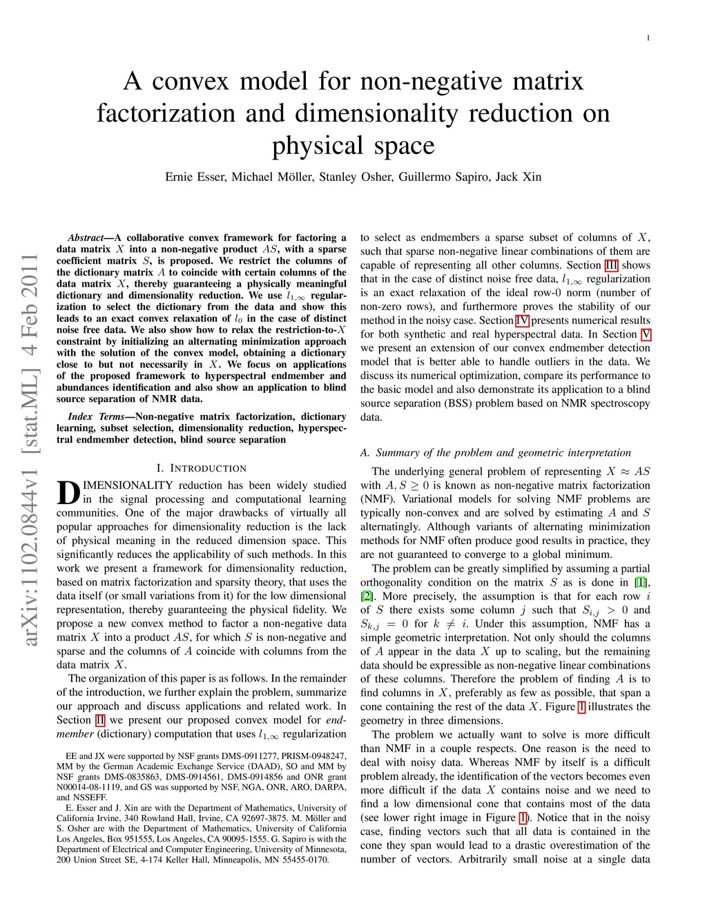 A collaborative convex framework for factoring a data matrix into a non-negative product , with a sparse coefficient matrix , is proposed. We restrict the columns of the dictionary matrix to coincide with certain columns of the data matrix , thereby guaranteeing a physically meaningful dictionary and dimensionality reduction. We use regularization to select the dictionary from the data and show this leads to an exact convex relaxation of in the case of distinct noise free data. We also show how to relax the restriction-to- constraint by initializing an alternating minimization approach with the solution of the convex model, obtaining a dictionary close to but not necessarily in . We focus on applications of the proposed framework to hyperspectral endmember and abundances identification and also show an application to blind source separation of NMR data.