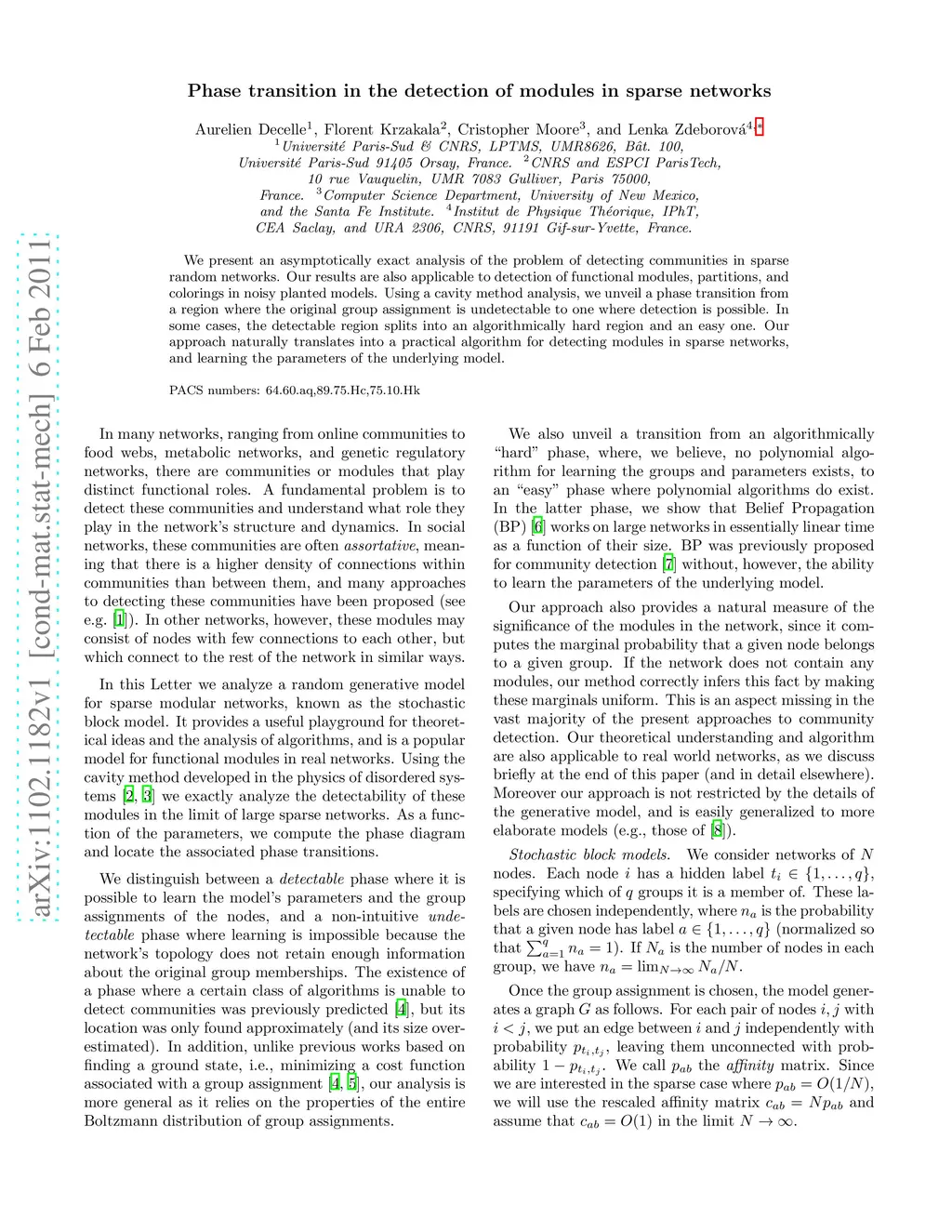 We present an asymptotically exact analysis of the problem of detecting communities in sparse random networks. Our results are also applicable to detection of functional modules, partitions, and colorings in noisy planted models. Using a cavity method analysis, we unveil a phase transition from a region where the original group assignment is undetectable to one where detection is possible. In some cases, the detectable region splits into an algorithmically hard region and an easy one. Our approach naturally translates into a practical algorithm for detecting modules in sparse networks, and learning the parameters of the underlying model.