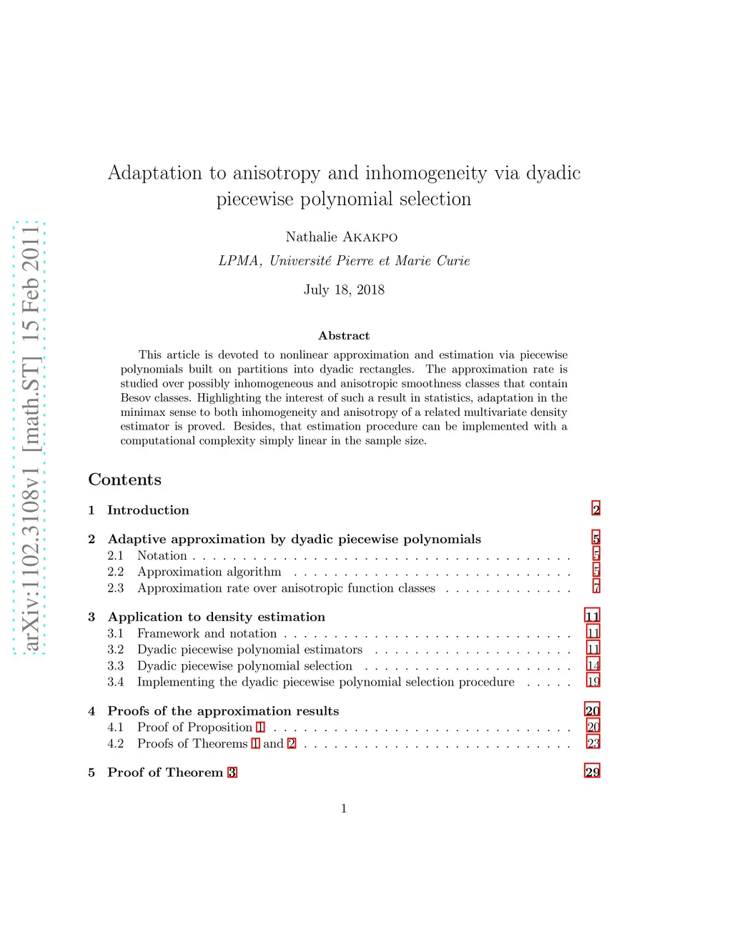 This article is devoted to nonlinear approximation and estimation via piecewise polynomials built on partitions into dyadic rectangles. The approximation rate is studied over possibly inhomogeneous and anisotropic smoothness classes that contain Besov classes. Highlighting the interest of such a result in statistics, adaptation in the minimax sense to both inhomogeneity and anisotropy of a related multivariate density estimator is proved. Besides, that estimation procedure can be implemented with a computational complexity simply linear in the sample size.
