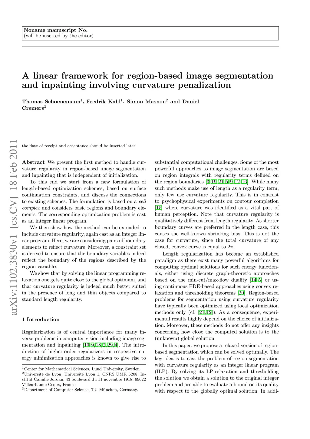We present the first method to handle curvature regularity in region-based image segmentation and inpainting that is independent of initialization. To this end we start from a new formulation of length-based optimization schemes, based on surface continuation constraints, and discuss the connections to existing schemes. The formulation is based on a \emph{cell complex} and considers basic regions and boundary elements. The corresponding optimization problem is cast as an integer linear program. We then show how the method can be extended to include curvature regularity, again cast as an integer linear program. Here, we are considering pairs of boundary elements to reflect curvature. Moreover, a constraint set is derived to ensure that the boundary variables indeed reflect the boundary of the regions described by the region variables. We show that by solving the linear programming relaxation one gets quite close to the global optimum, and that curvature regularity is indeed much better suited in the presence of long and thin objects compared to standard length regularity.