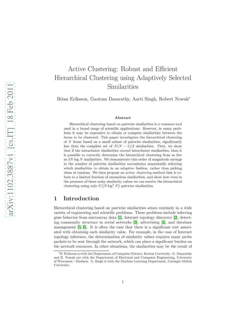 Hierarchical clustering based on pairwise similarities is a common tool used in a broad range of scientific applications. However, in many problems it may be expensive to obtain or compute similarities between the items to be clustered. This paper investigates the hierarchical clustering of N items based on a small subset of pairwise similarities, significantly less than the complete set of N(N-1)/2 similarities. First, we show that if the intracluster similarities exceed intercluster similarities, then it is possible to correctly determine the hierarchical clustering from as few as 3N log N similarities. We demonstrate this order of magnitude savings in the number of pairwise similarities necessitates sequentially selecting which similarities to obtain in an adaptive fashion, rather than picking them at random. We then propose an active clustering method that is robust to a limited fraction of anomalous similarities, and show how even in the presence of these noisy similarity values we can resolve the hierarchical clustering using only O(N log^2 N) pairwise similarities.