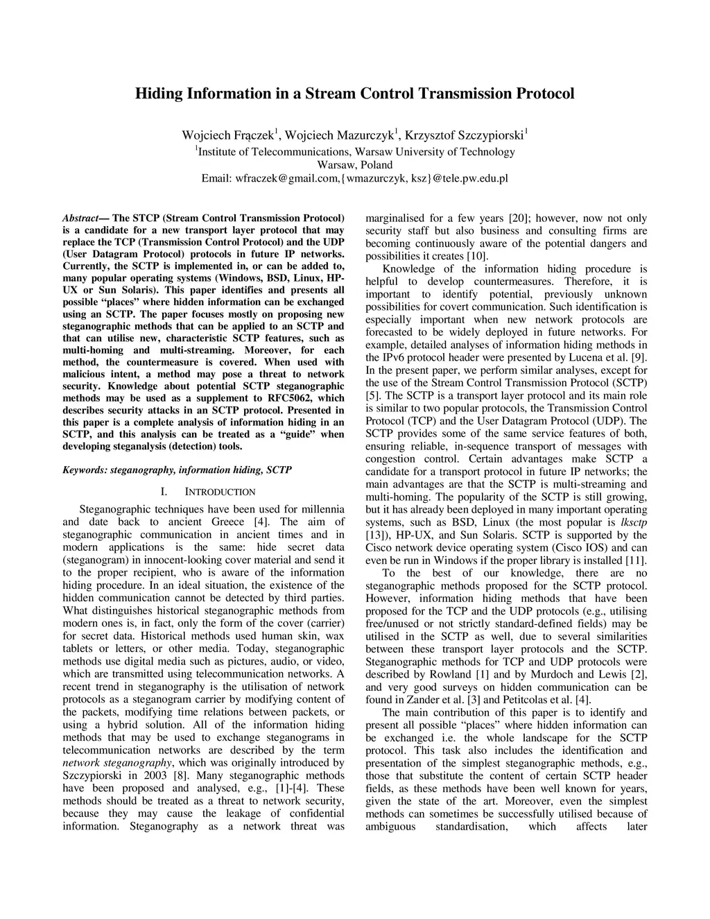 The STCP (Stream Control Transmission Protocol) is a candidate for a new transport layer protocol that may replace the TCP (Transmission Control Protocol) and the UDP (User Datagram Protocol) protocols in future IP networks. Currently, the SCTP is implemented in, or can be added to, many popular operating systems (Windows, BSD, Linux, HPUX or Sun Solaris). This paper identifies and presents all possible "places" where hidden information can be exchanged using an SCTP. The paper focuses mostly on proposing new steganographic methods that can be applied to an SCTP and that can utilise new, characteristic SCTP features, such as multi-homing and multi-streaming. Moreover, for each method, the countermeasure is covered. When used with malicious intent, a method may pose a threat to network security. Knowledge about potential SCTP steganographic methods may be used as a supplement to RFC5062, which describes security attacks in an SCTP protocol. Presented in this paper is a complete analysis of information hiding in an SCTP, and this analysis can be treated as a "guide" when developing steganalysis (detection) tools.