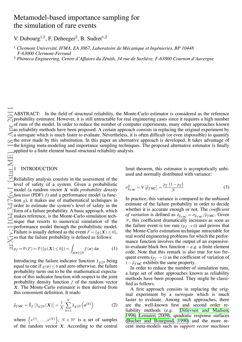 In the field of structural reliability, the Monte-Carlo estimator is considered as the reference probability estimator. However, it is still untractable for real engineering cases since it requires a high number of runs of the model. In order to reduce the number of computer experiments, many other approaches known as reliability methods have been proposed. A certain approach consists in replacing the original experiment by a surrogate which is much faster to evaluate. Nevertheless, it is often difficult (or even impossible) to quantify the error made by this substitution. In this paper an alternative approach is developed. It takes advantage of the kriging meta-modeling and importance sampling techniques. The proposed alternative estimator is finally applied to a finite element based structural reliability analysis.