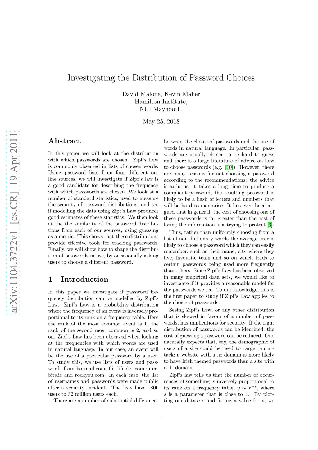In this paper we will look at the distribution with which passwords are chosen. Zipf's Law is commonly observed in lists of chosen words. Using password lists from four different on-line sources, we will investigate if Zipf's law is a good candidate for describing the frequency with which passwords are chosen. We look at a number of standard statistics, used to measure the security of password distributions, and see if modelling the data using Zipf's Law produces good estimates of these statistics. We then look at the the similarity of the password distributions from each of our sources, using guessing as a metric. This shows that these distributions provide effective tools for cracking passwords. Finally, we will show how to shape the distribution of passwords in use, by occasionally asking users to choose a different password.