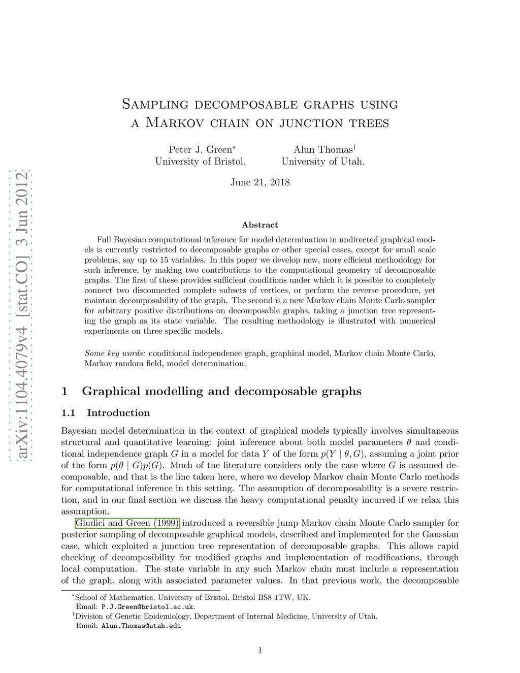 Full Bayesian computational inference for model determination in undirected graphical models is currently restricted to decomposable graphs, except for problems of very small scale. In this paper we develop new, more efficient methodology for such inference, by making two contributions to the computational geometry of decomposable graphs. The first of these provides sufficient conditions under which it is possible to completely connect two disconnected complete subsets of vertices, or perform the reverse procedure, yet maintain decomposability of the graph. The second is a new Markov chain Monte Carlo sampler for arbitrary positive distributions on decomposable graphs, taking a junction tree representing the graph as its state variable. The resulting methodology is illustrated with numerical experiments on three specific models.