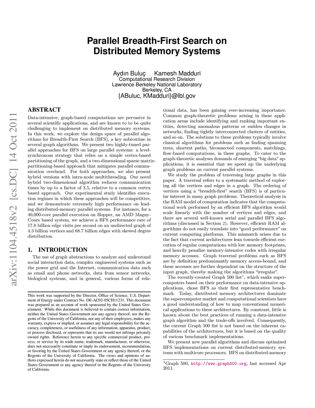 Data-intensive, graph-based computations are pervasive in several scientific applications, and are known to to be quite challenging to implement on distributed memory systems. In this work, we explore the design space of parallel algorithms for Breadth-First Search (BFS), a key subroutine in several graph algorithms. We present two highly-tuned parallel approaches for BFS on large parallel systems: a level-synchronous strategy that relies on a simple vertex-based partitioning of the graph, and a two-dimensional sparse matrix-partitioning-based approach that mitigates parallel communication overhead. For both approaches, we also present hybrid versions with intra-node multithreading. Our novel hybrid two-dimensional algorithm reduces communication times by up to a factor of 3.5, relative to a common vertex based approach. Our experimental study identifies execution regimes in which these approaches will be competitive, and we demonstrate extremely high performance on leading distributed-memory parallel systems. For instance, for a 40,000-core parallel execution on Hopper, an AMD Magny-Cours based system, we achieve a BFS performance rate of 17.8 billion edge visits per second on an undirected graph of 4.3 billion vertices and 68.7 billion edges with skewed degree distribution.